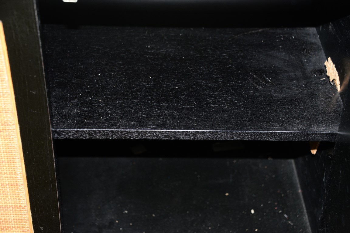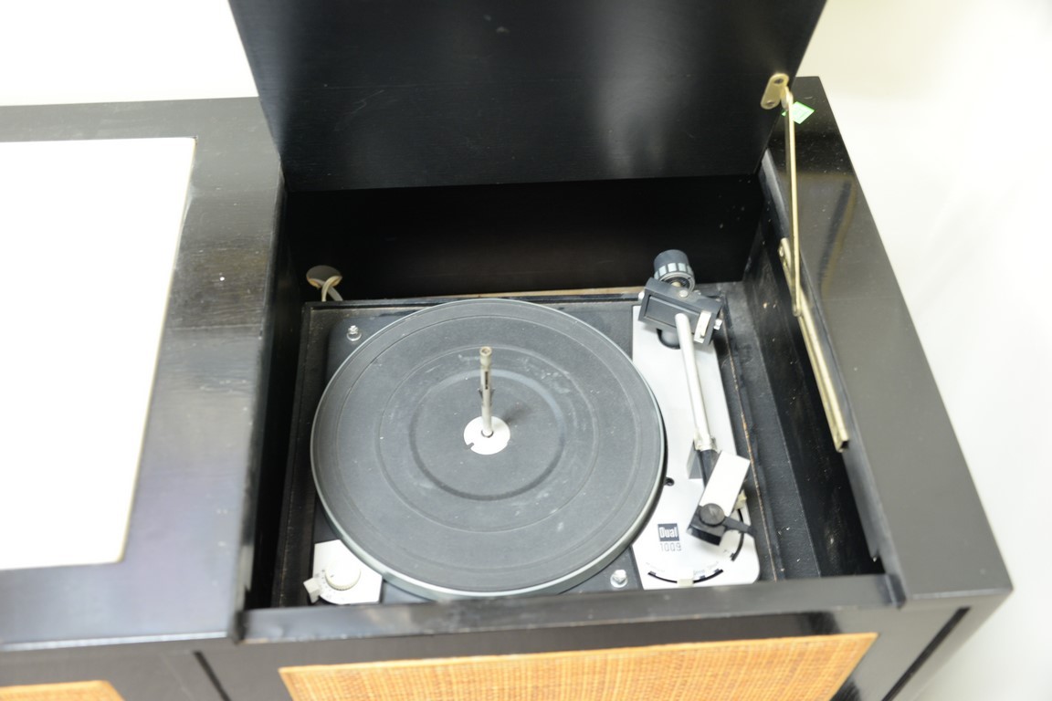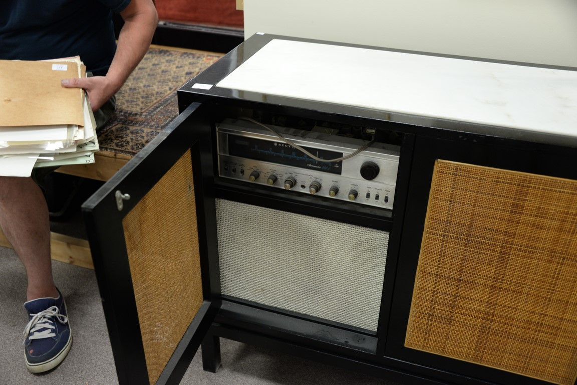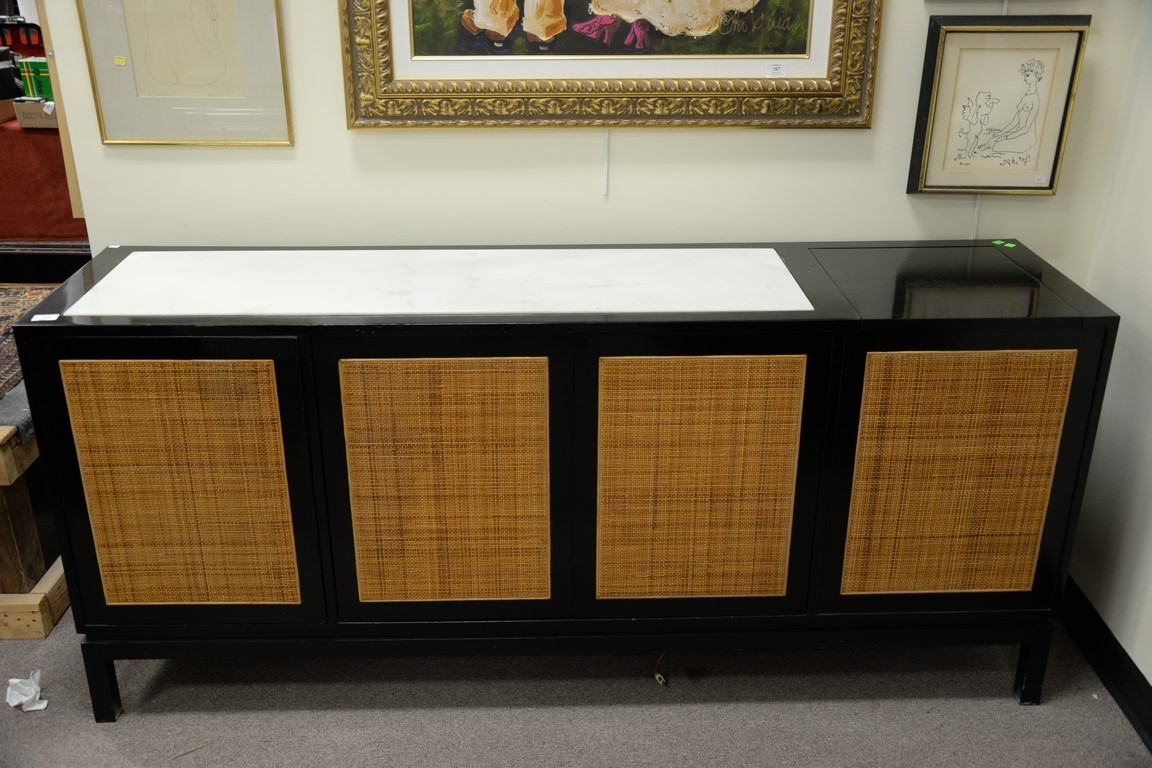 Lot 442: Mid-Century Probber style credenza, caned and marble top with dual turntable, speakers, and Scott Tube receiver. ht. 32in., wd. 72in…