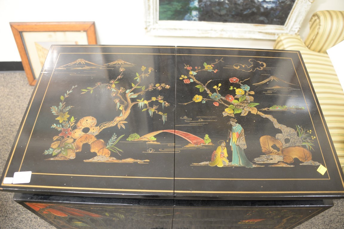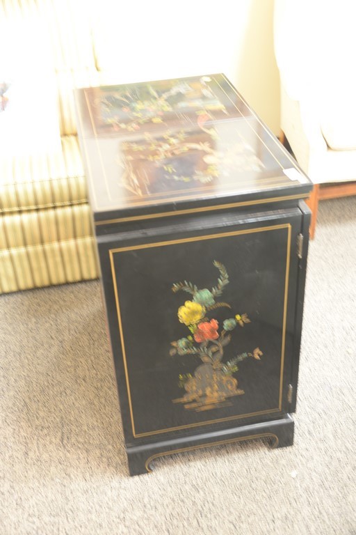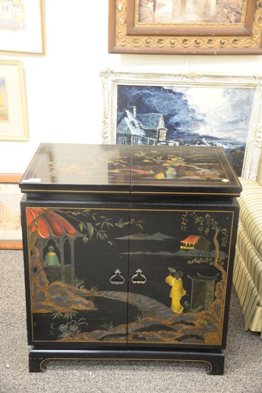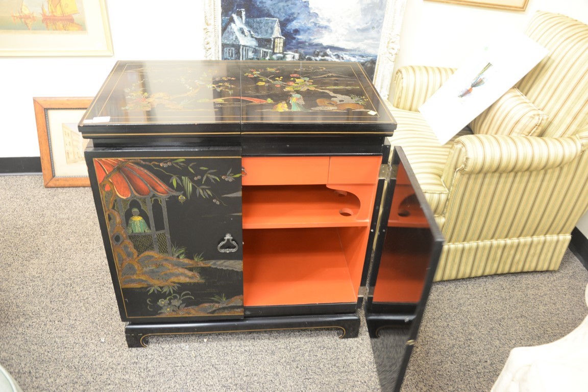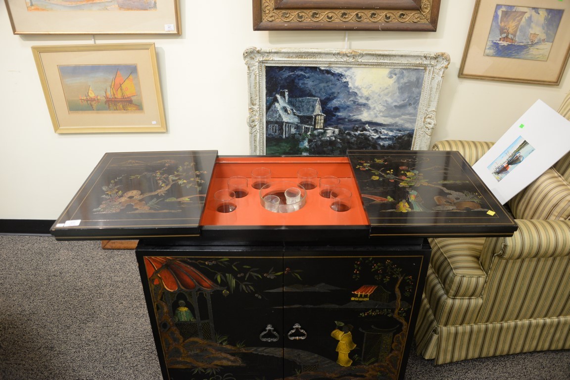 Lot 442: Oriental bar cabinet, top opens to fitted glasses. Provenance: Estate of Arthur C. Pinto, MD