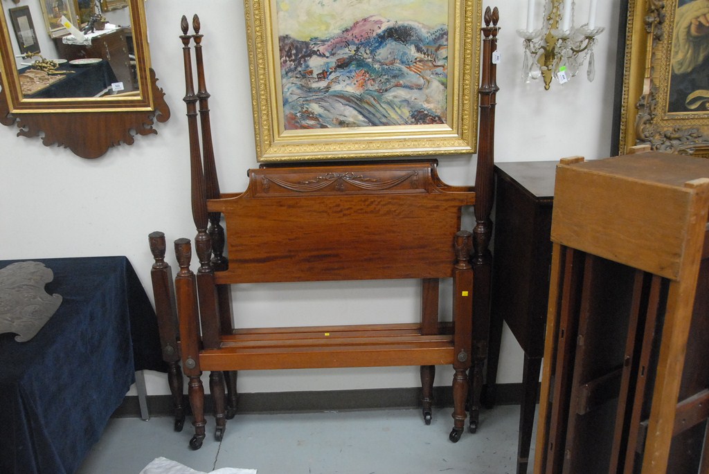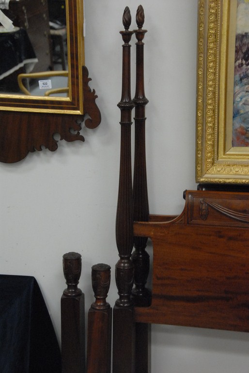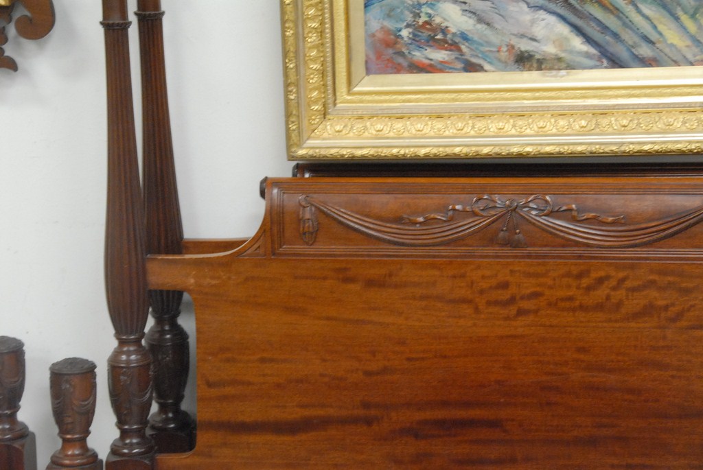 Lot 442: Pair of Margolis twin beds with tall front posts fluted and drape carved, headboards carved with swag and drapes, footboards low pos…