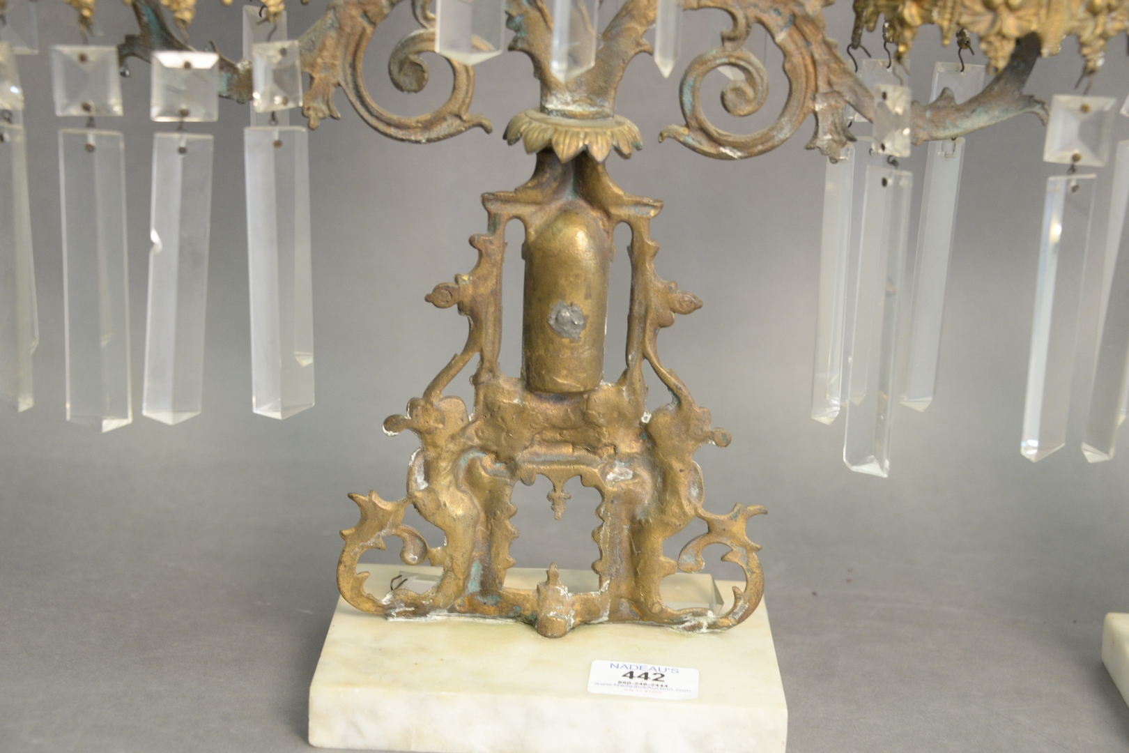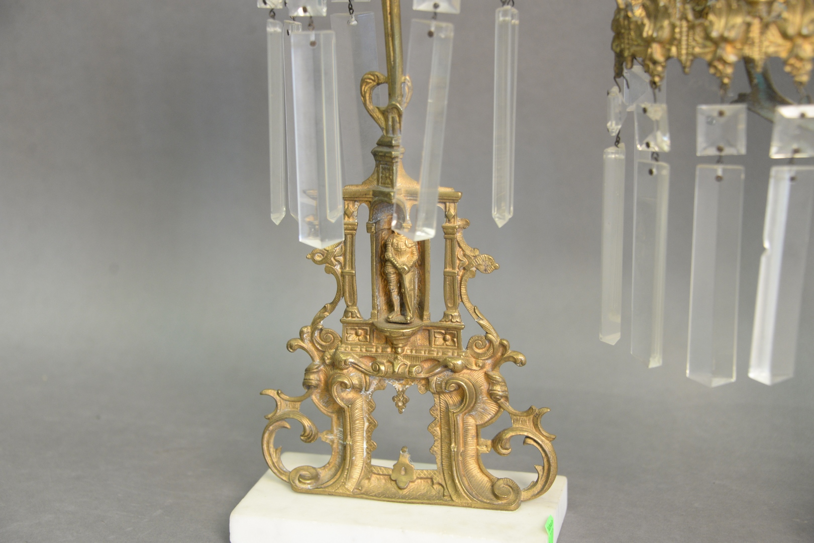 Lot 442: Three Piece Figural Girandole Set, to include a pair of candlesticks, along with three-armed candelabra, each mounted on marble base, height of tallest 17 inches. Provenance: Estate of James Wadhams