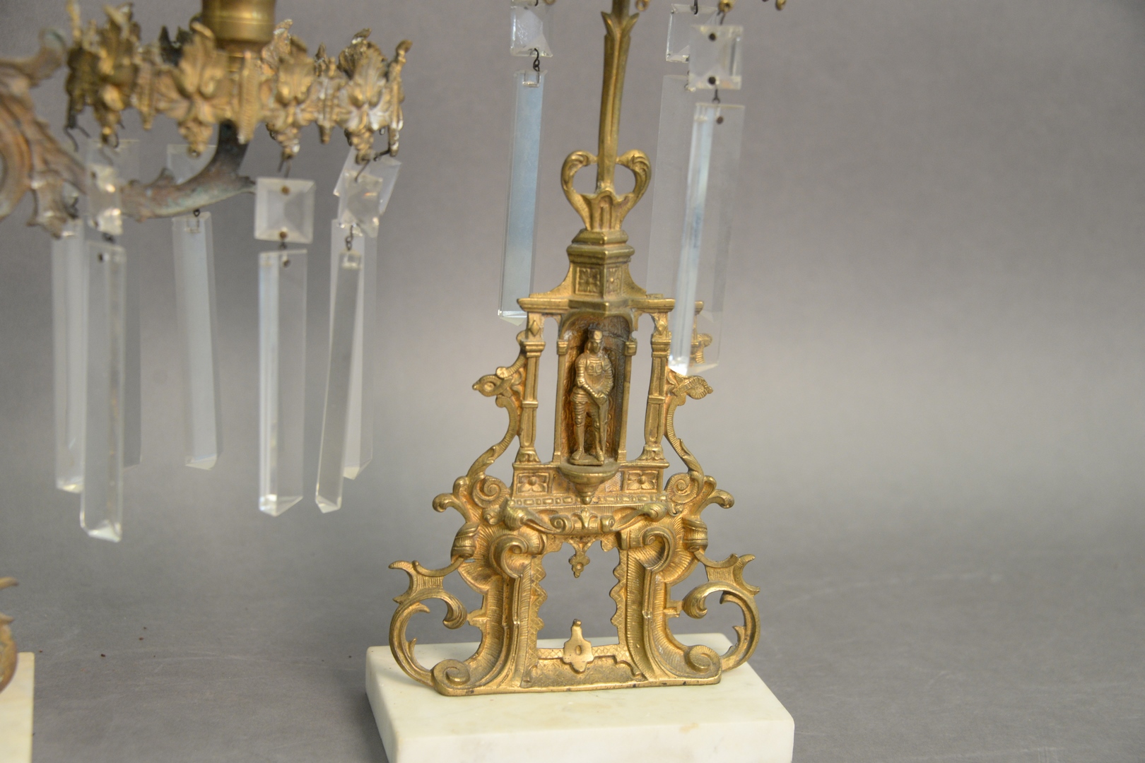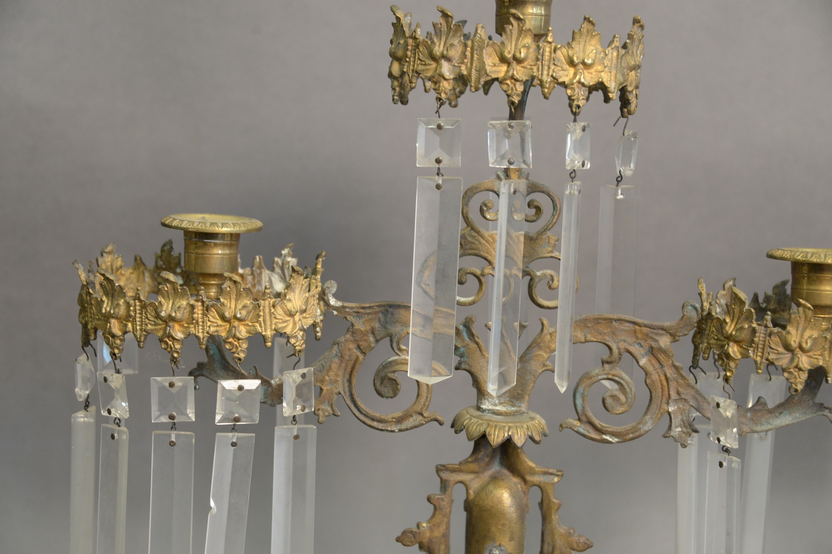 Three Piece Figural Girandole Set, to include a pair of candlesticks, along with three-armed candelabra, each mounted on marble base, height of tallest 17 inches. Provenance: Estate of James Wadhams