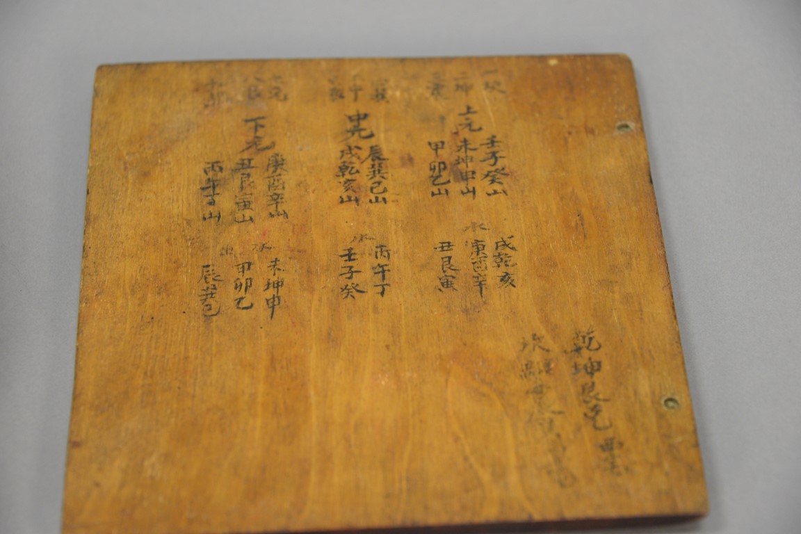 Chinese compass in wood case, paper laid on board with cover board, probably 18th century along with a Chinese black lacquered box with gold painted courtyard scene with scholars. 6 1/4 x 6 1/4
