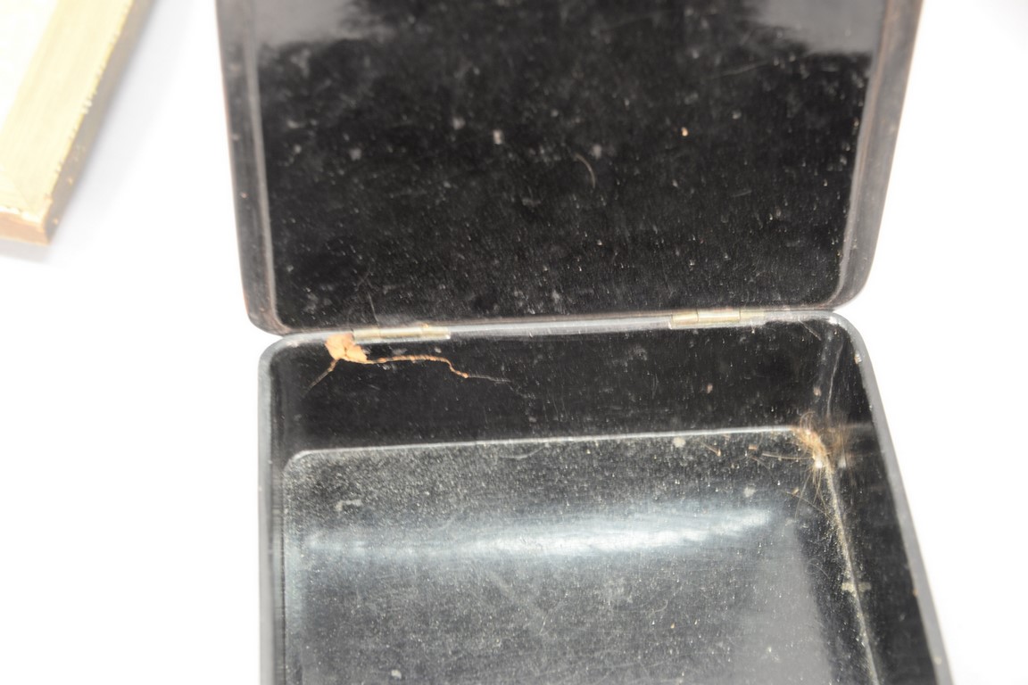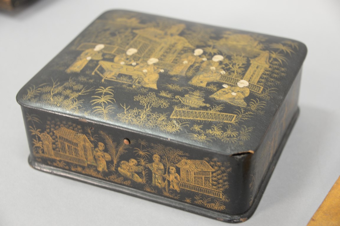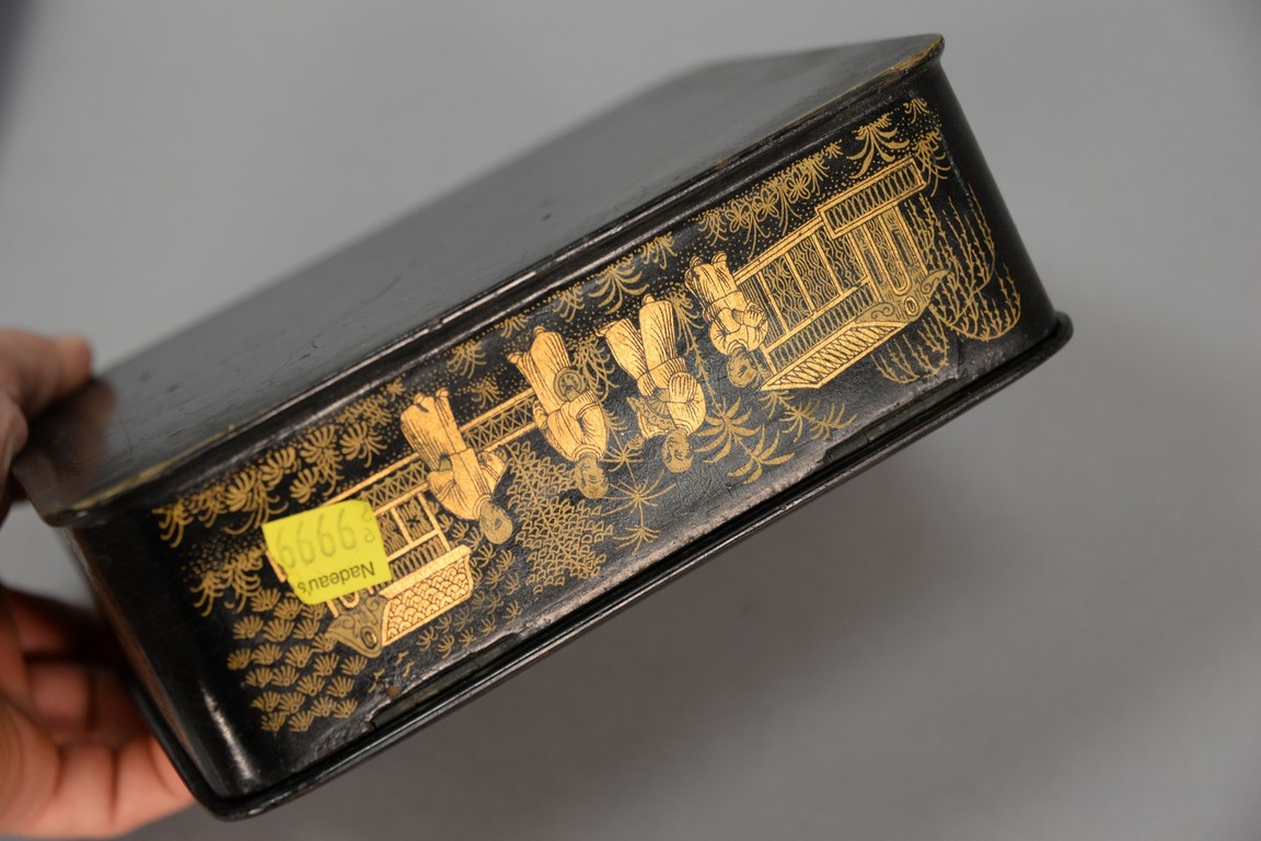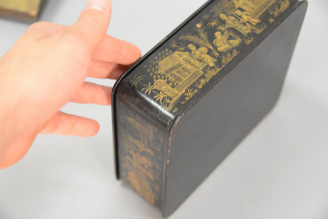 Lot 443: Chinese compass in wood case, paper laid on board with cover board, probably 18th century along with a Chinese black lacquered box w…