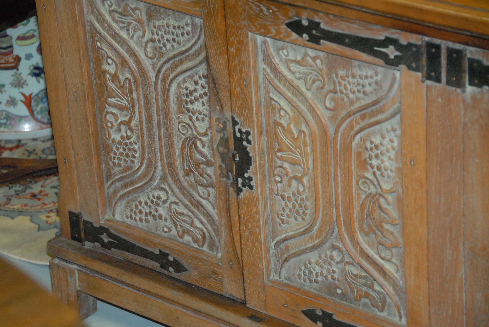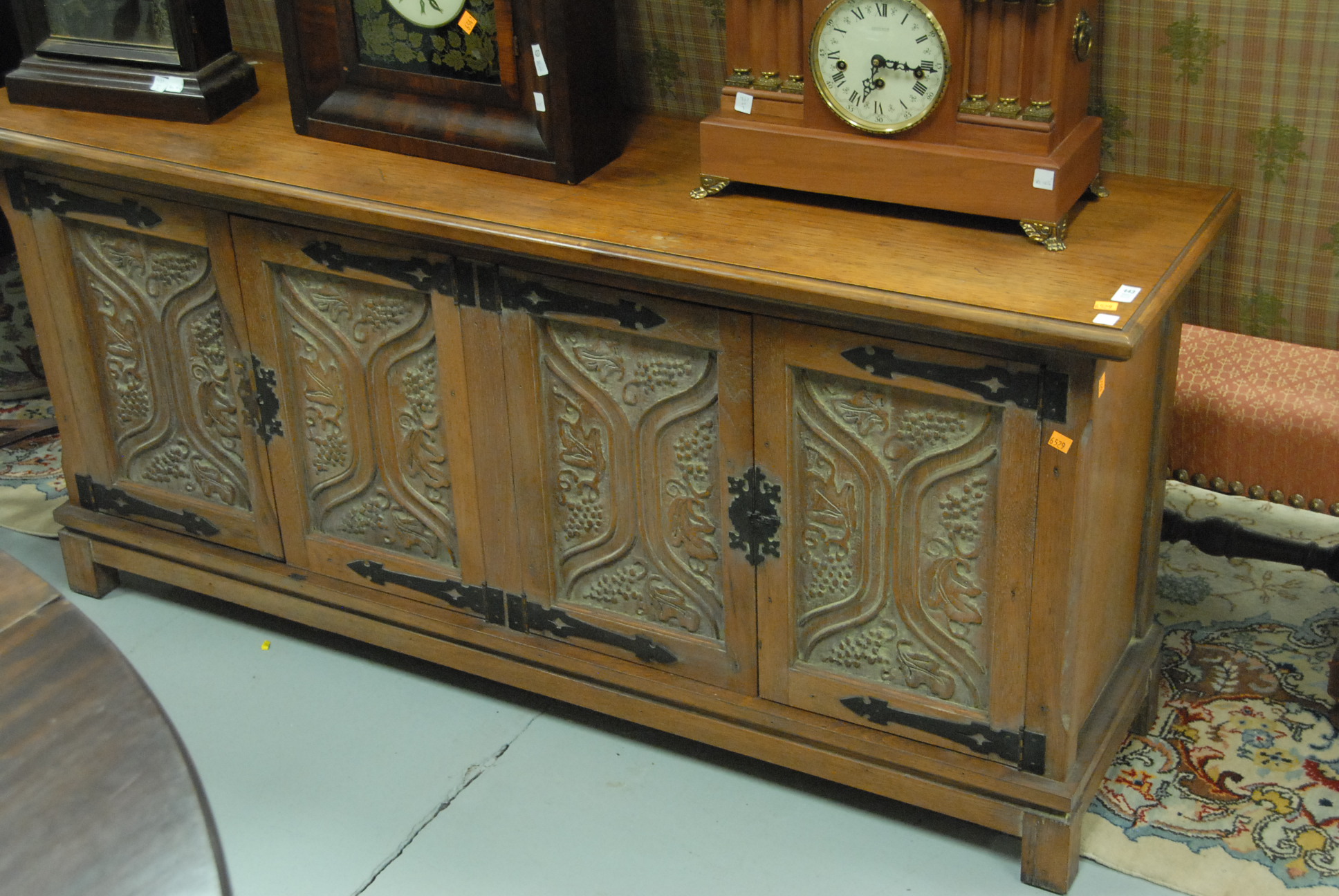 Four door oak cabinet with carved doors, lg. 58, ht. 27, dp. 15.