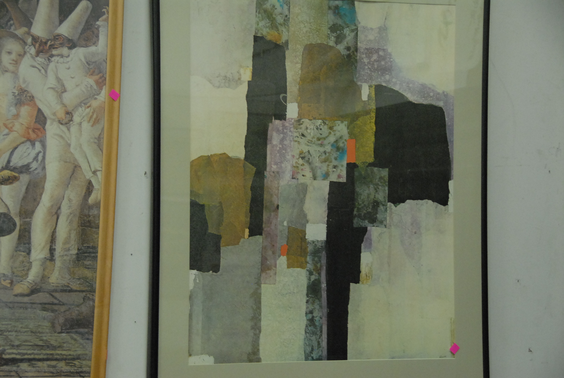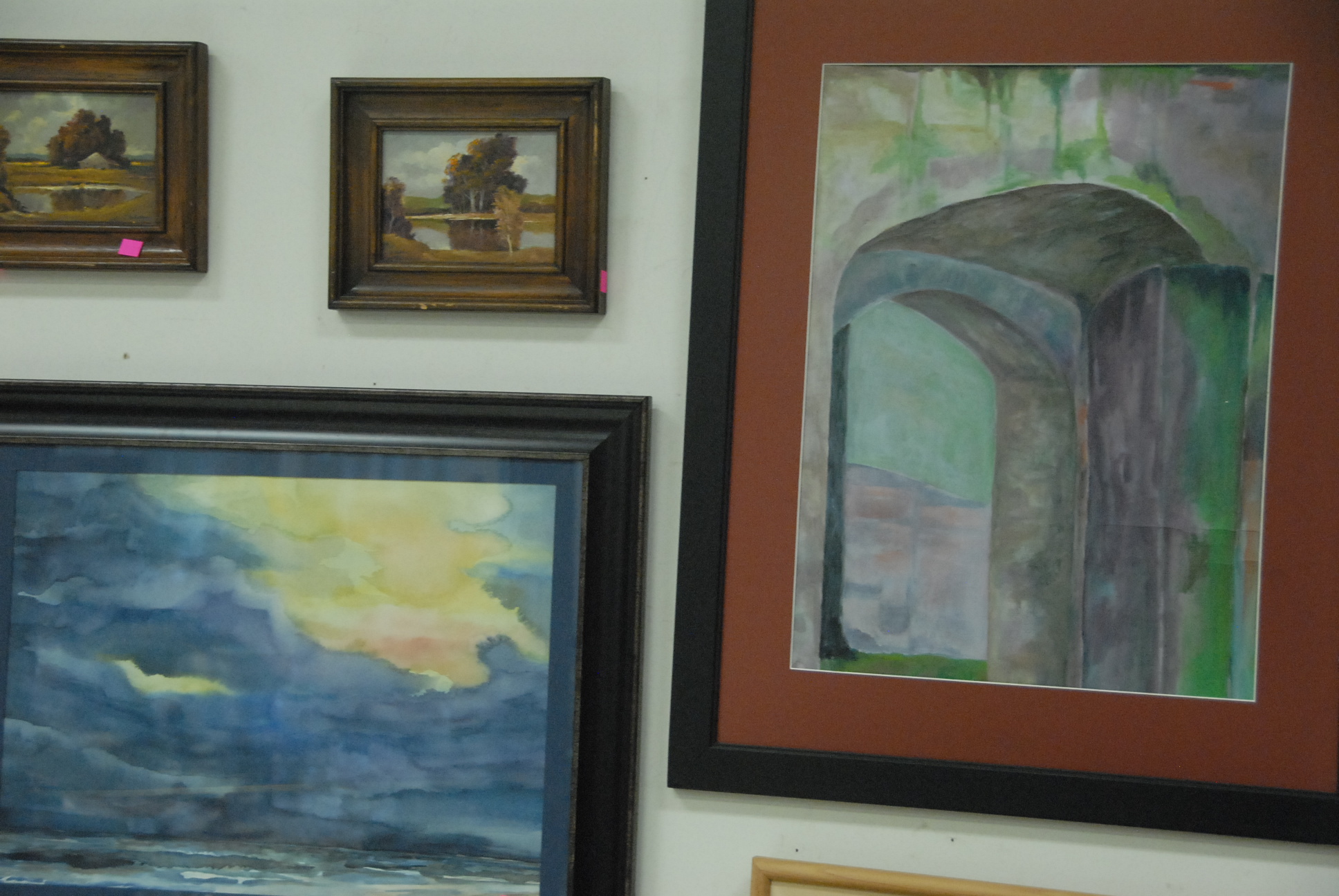 Lot 443: Group of 8 framed pieces to include two oil on boards signed Kellner, two watercolors, one mixed media, two prints and mirror.