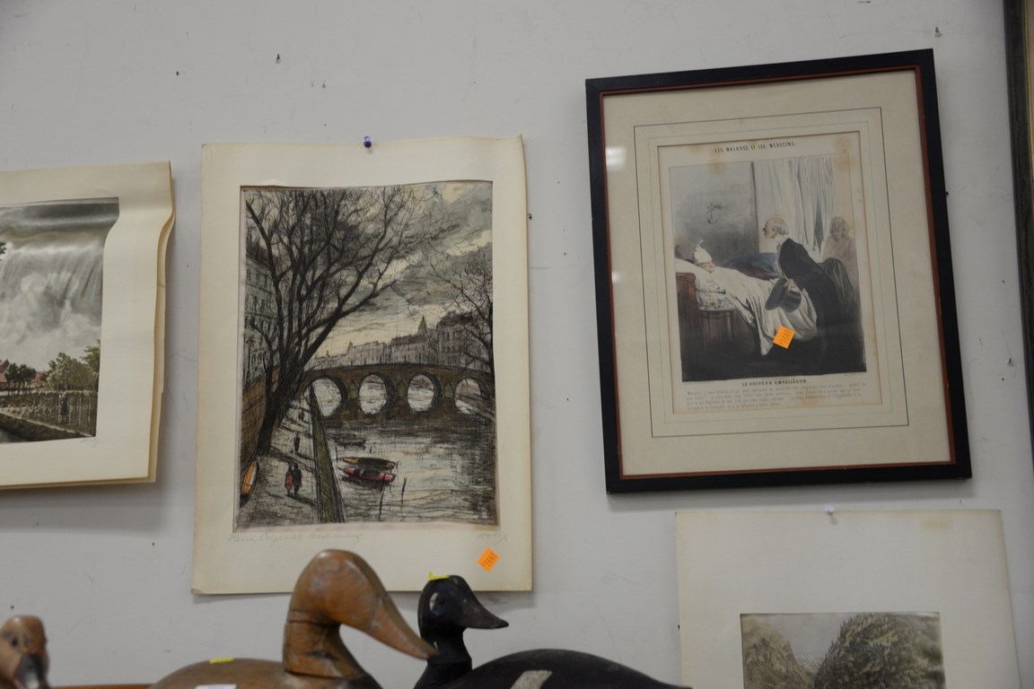 Group of prints, Tibetan wood block prints, and three framed prints.