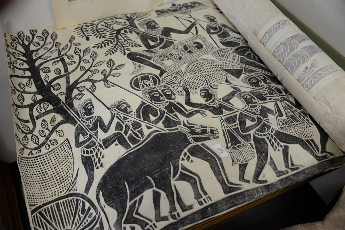 Lot 443: Group of prints, Tibetan wood block prints, and three framed prints.