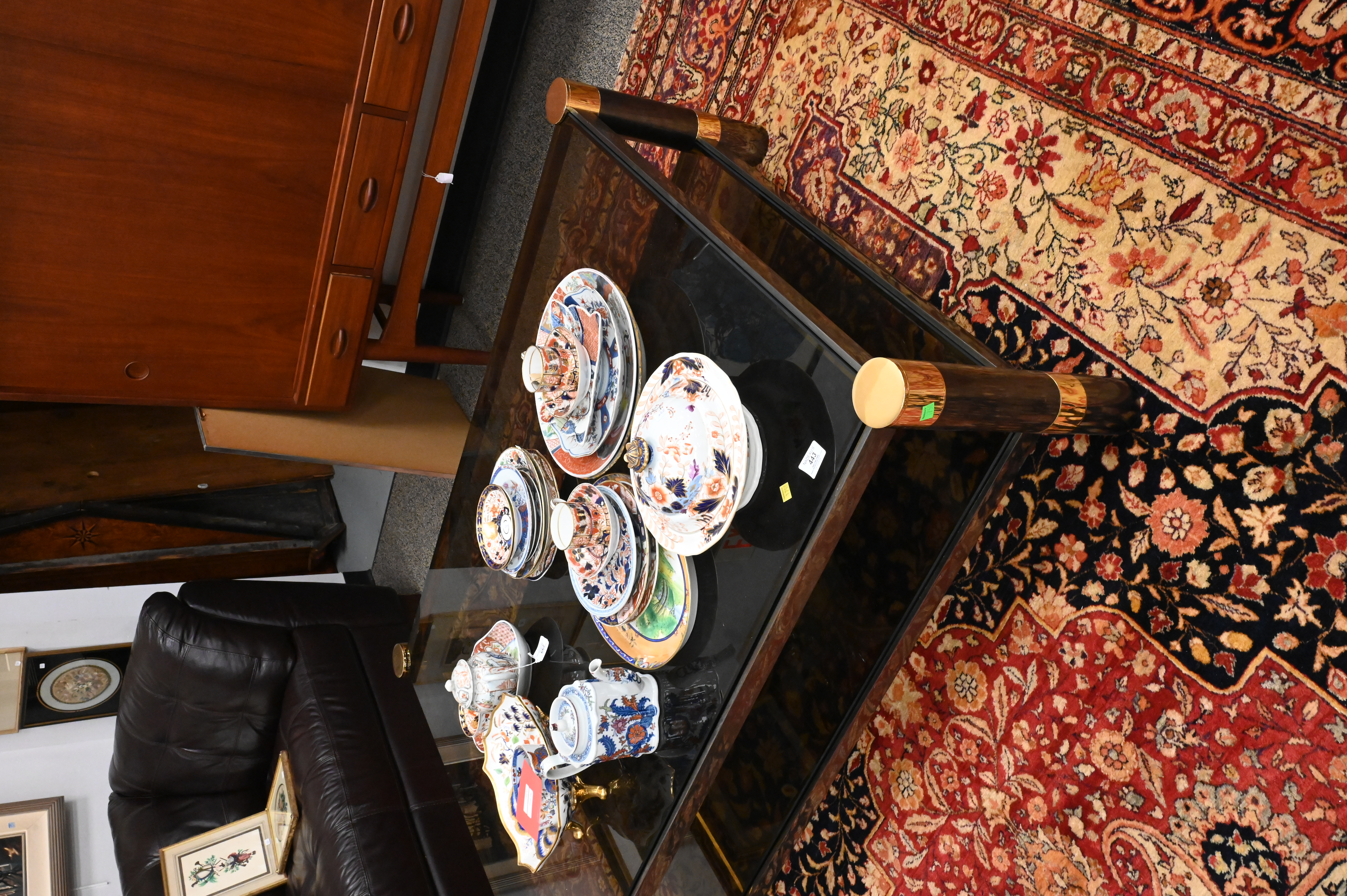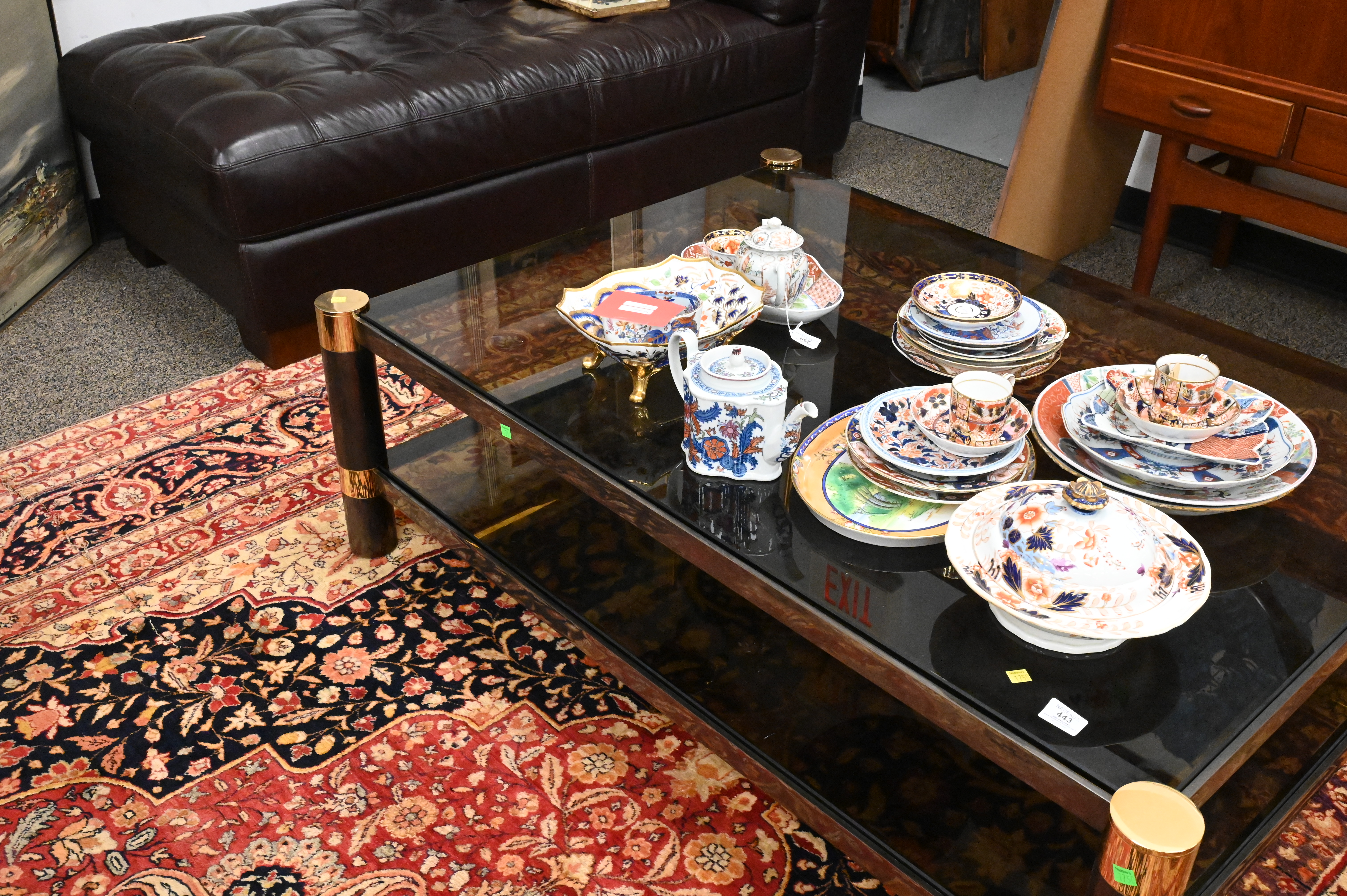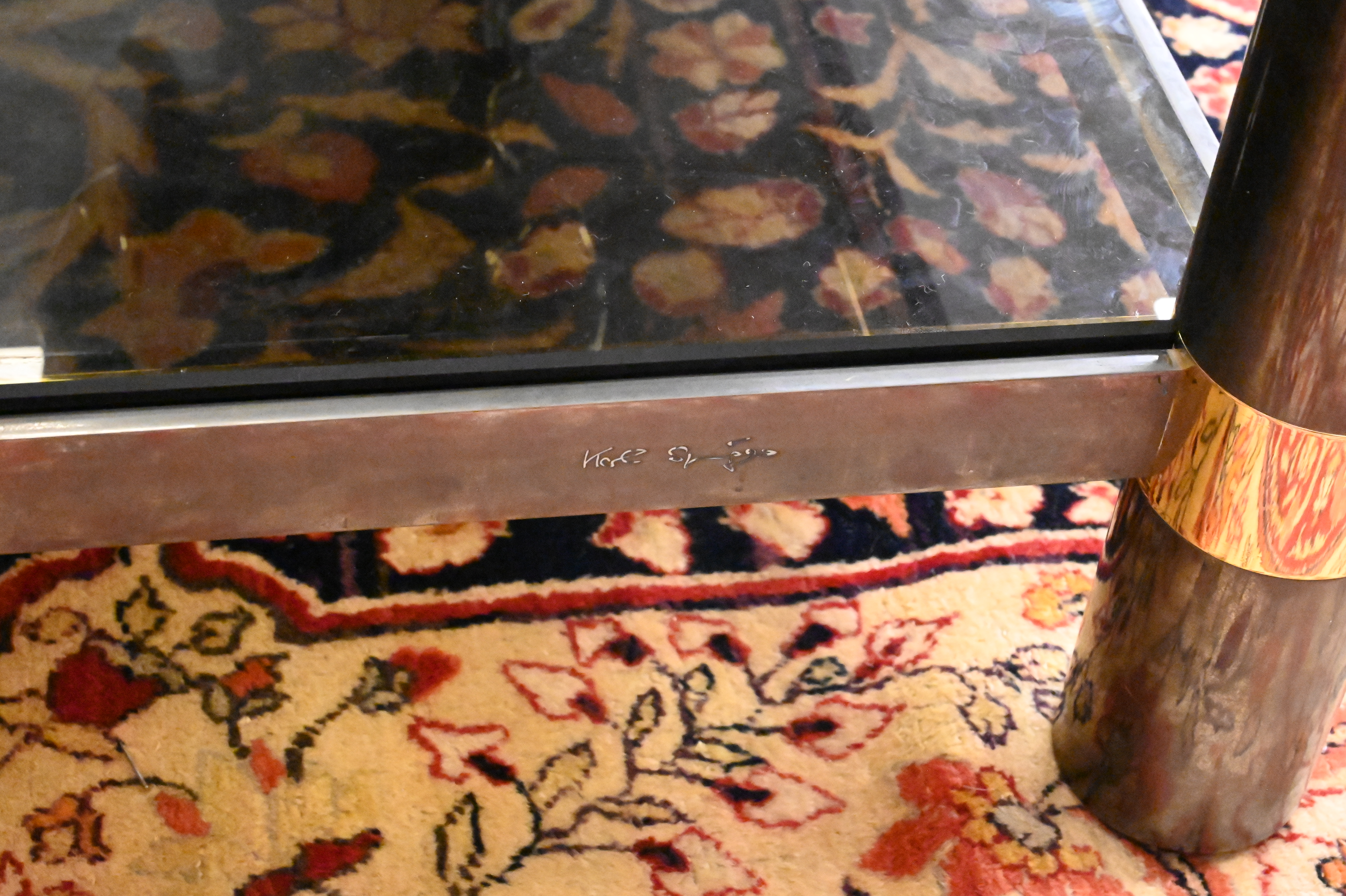 having two tiers of smoked glass set on brass and gunmetal frame, signed