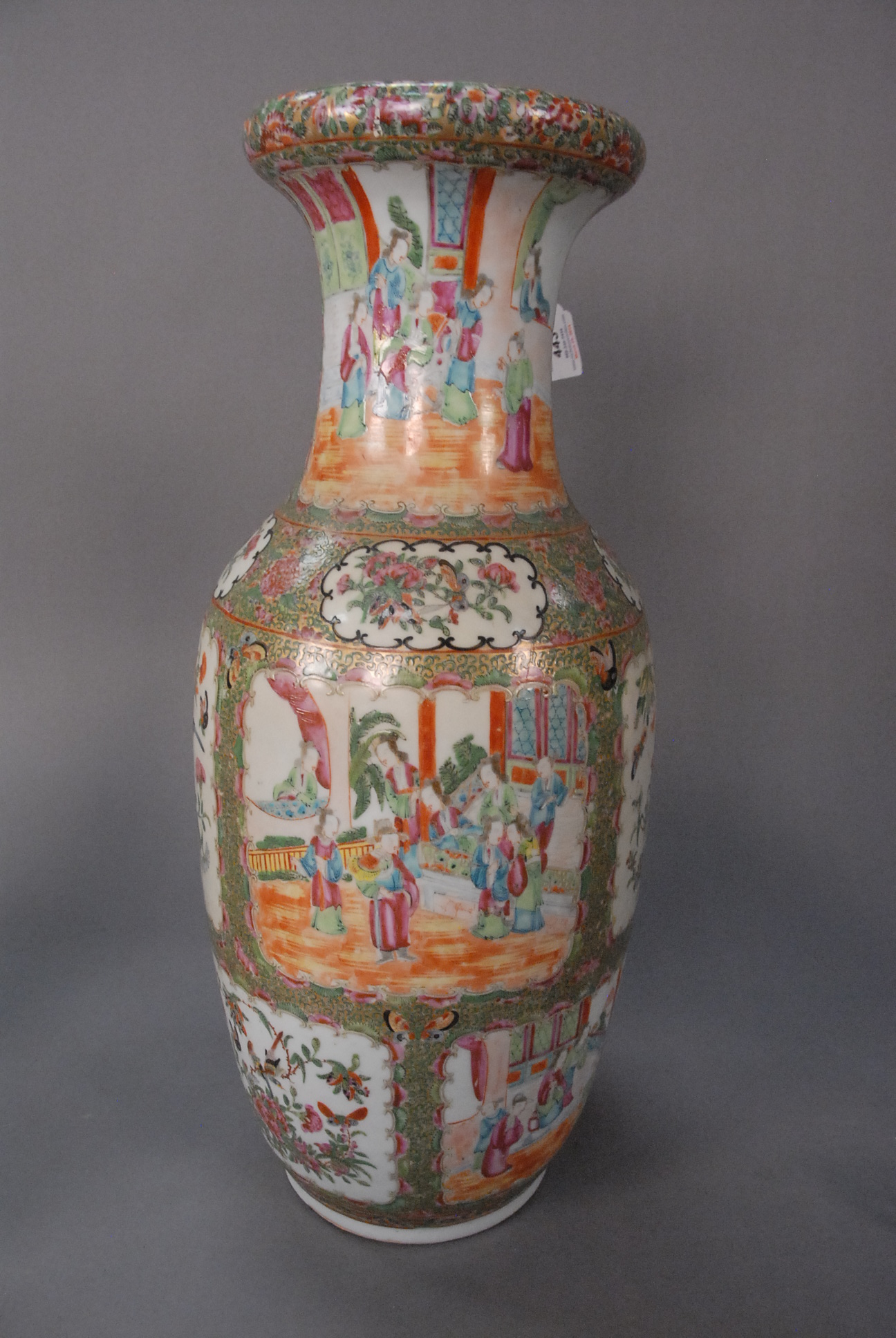 Large rose medallion baluster vase with inverted mouth rim, decorated with classic figural and bird & flower panels, China, 19th century. ht. 24in.