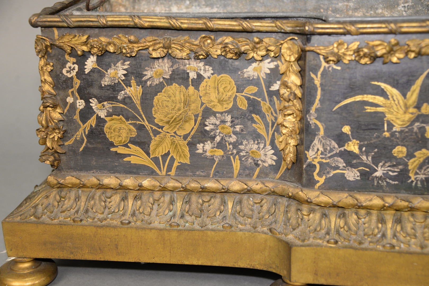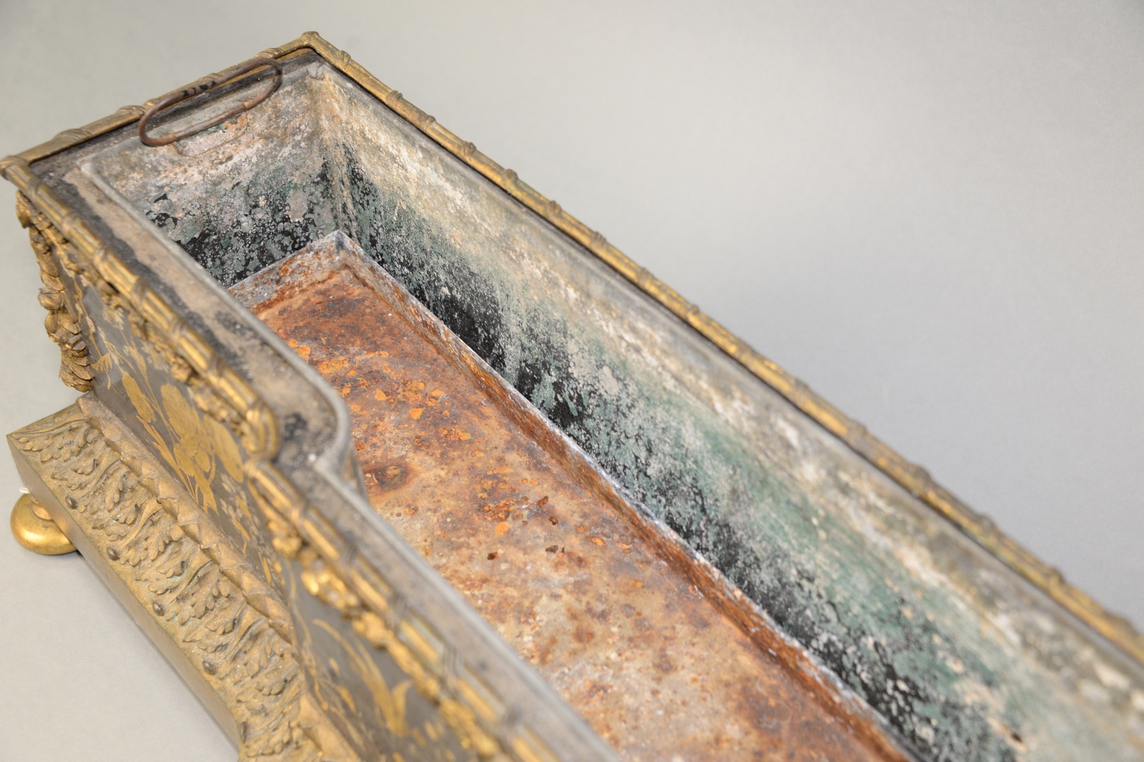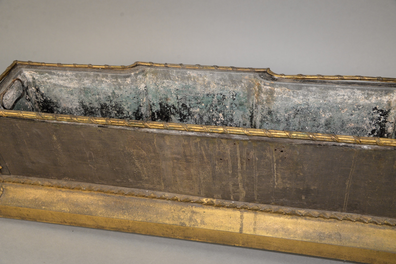 Large Victorian Dore Bronze Rectangular Planter having brass and silvered flower and bird design, bronze garland and flower mounts with tole liner height 9 inches, width 8 1/2 inches, length 29 1/4 inches Provenance: The Estate of Alina Roisen, Park Avenue, New York