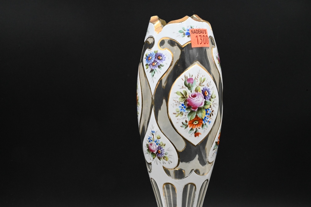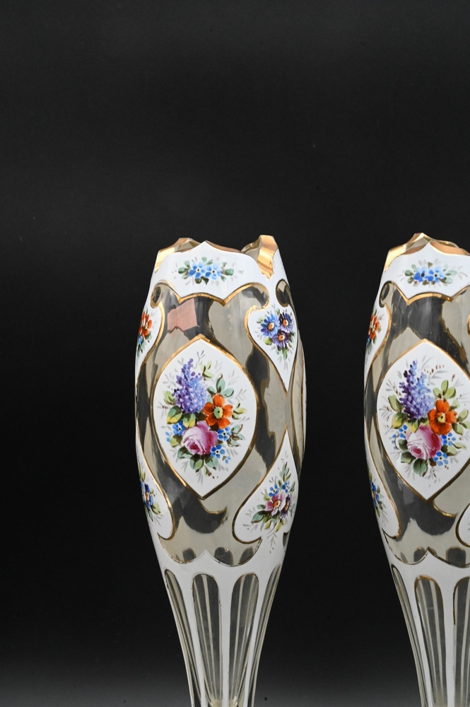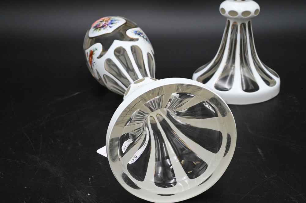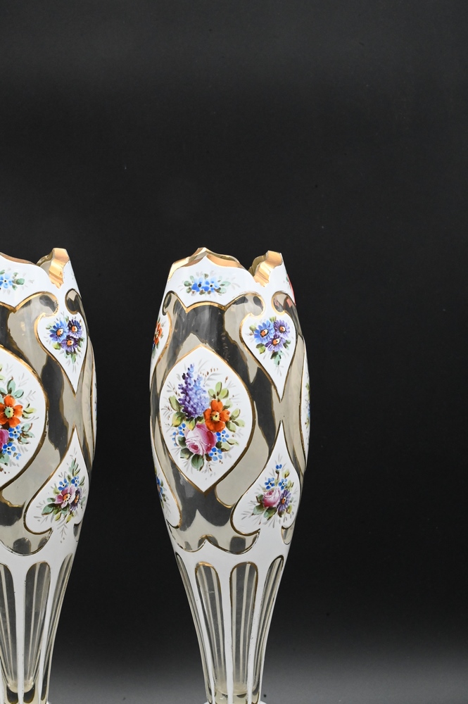 Pair of Overlay Glass Vases, 19th century Moser, enameled flowers, height 14 inches.