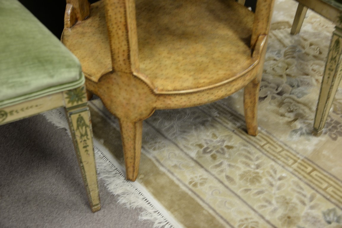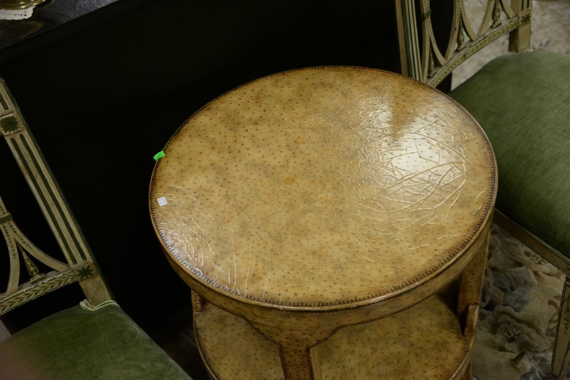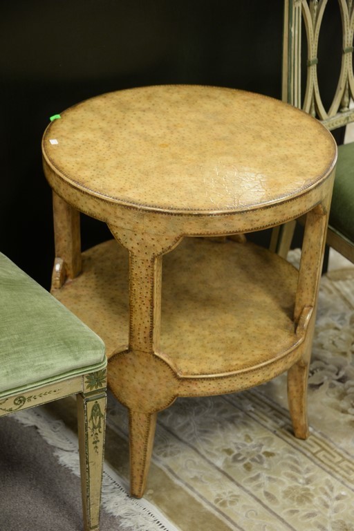 Lot 443: Round faux leather two tier stand, possibly Maitland Smith. ht. 26in., dia. 22in.