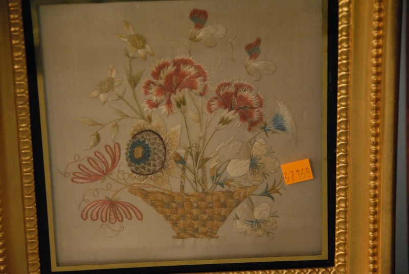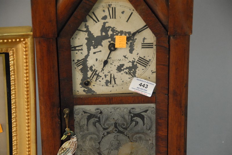 Seth Thomas steeple clock and gilt framed needlework. ht. 20in.