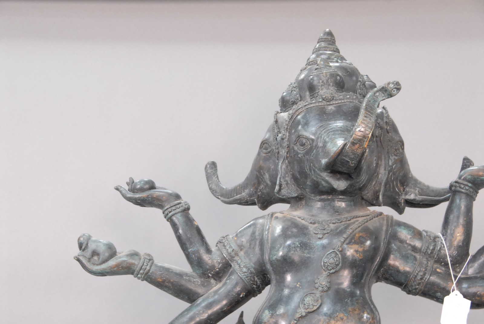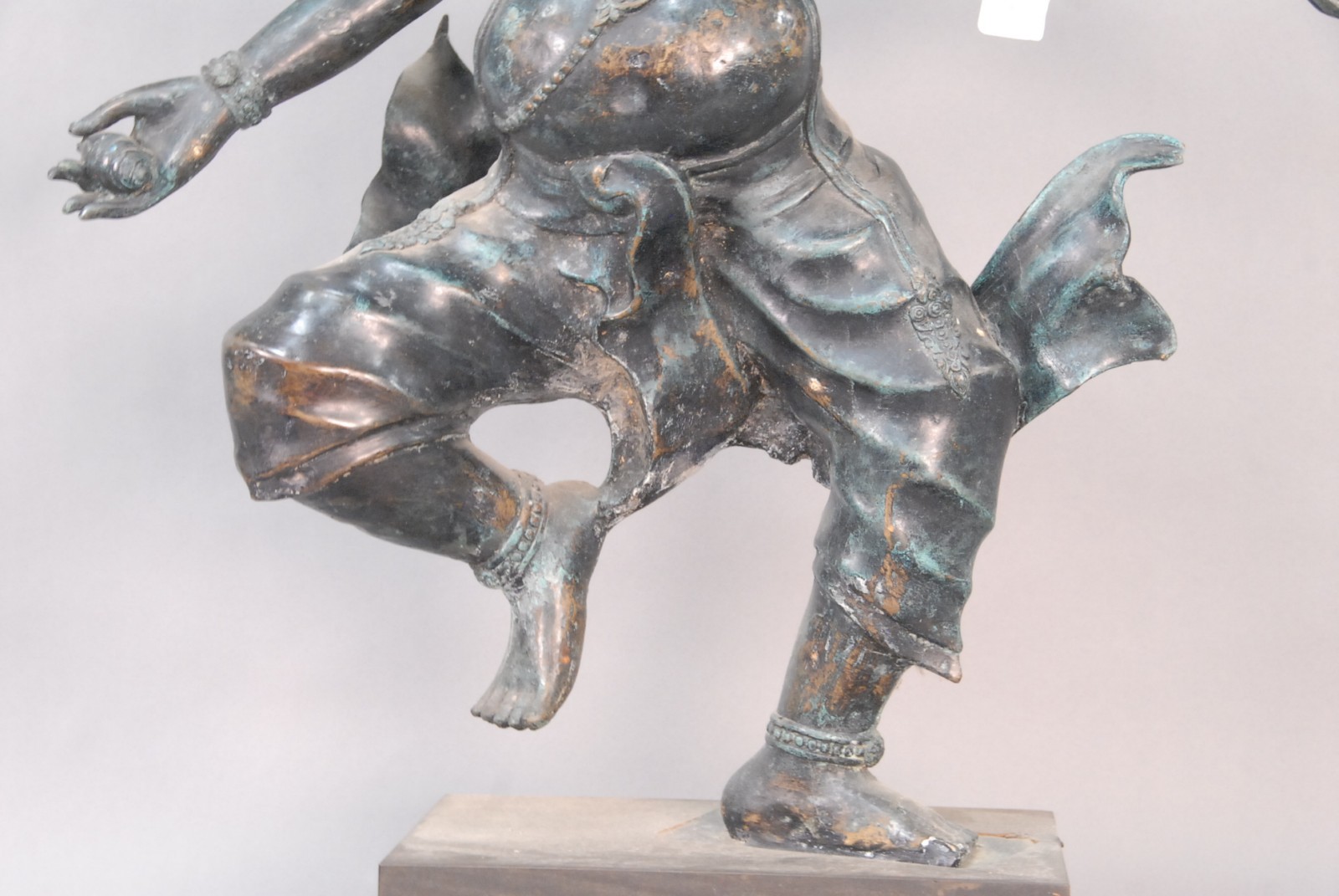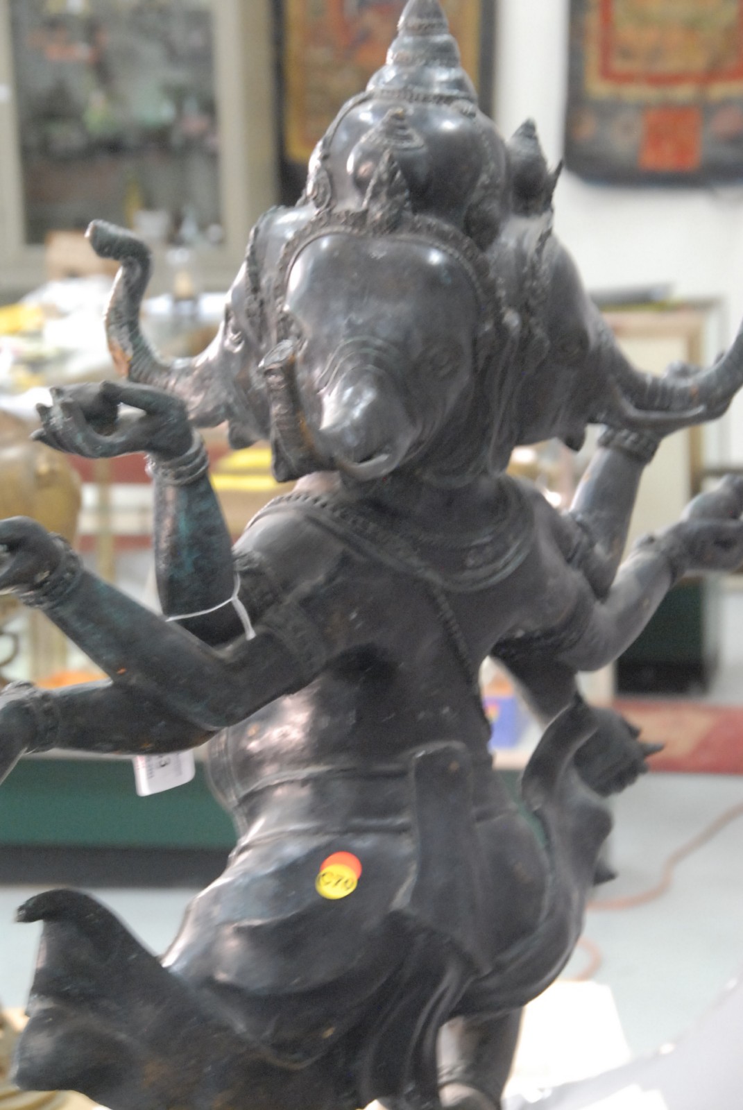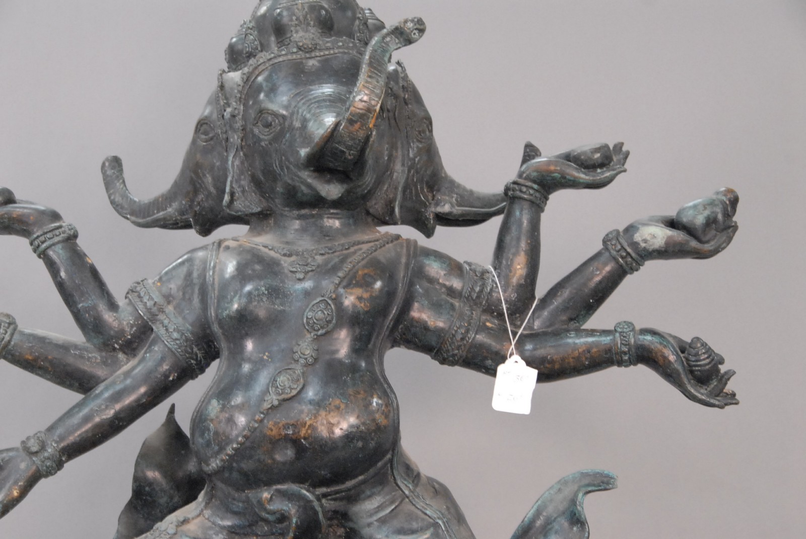 Very large Indian bronze of dancing three-faced and multiple armed deity, probably Ganesh.