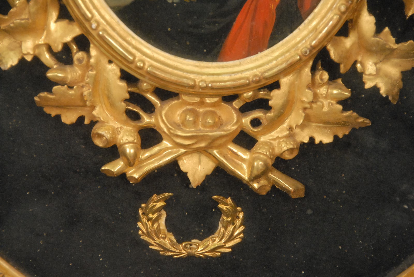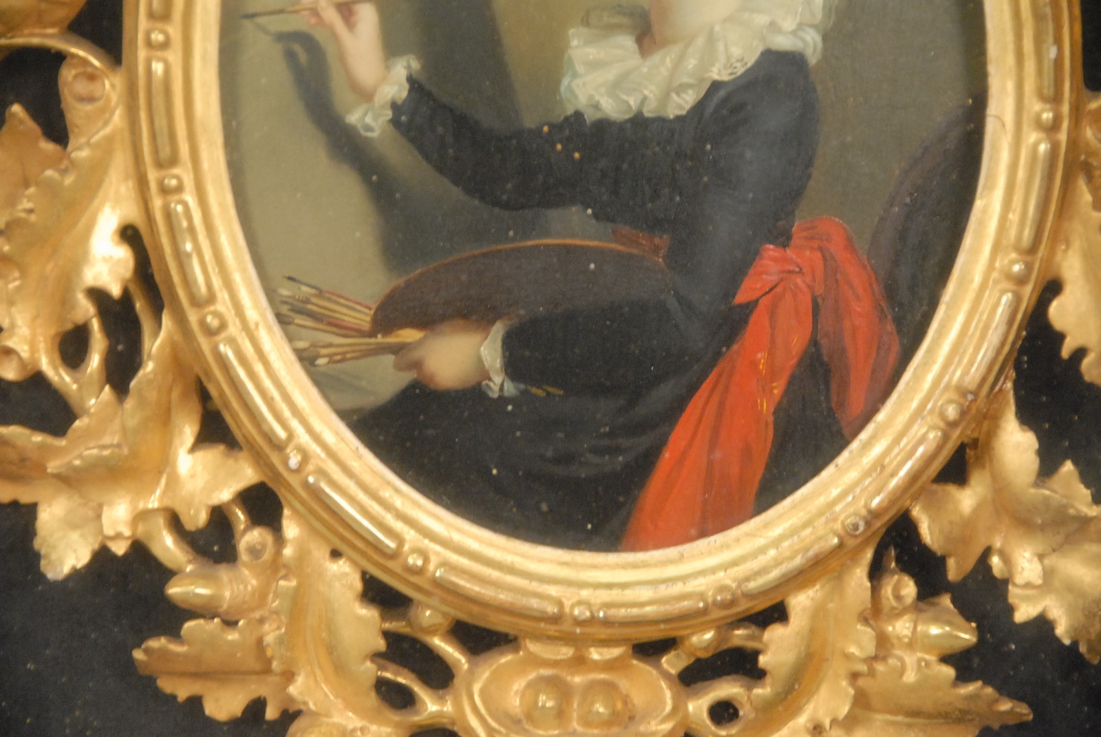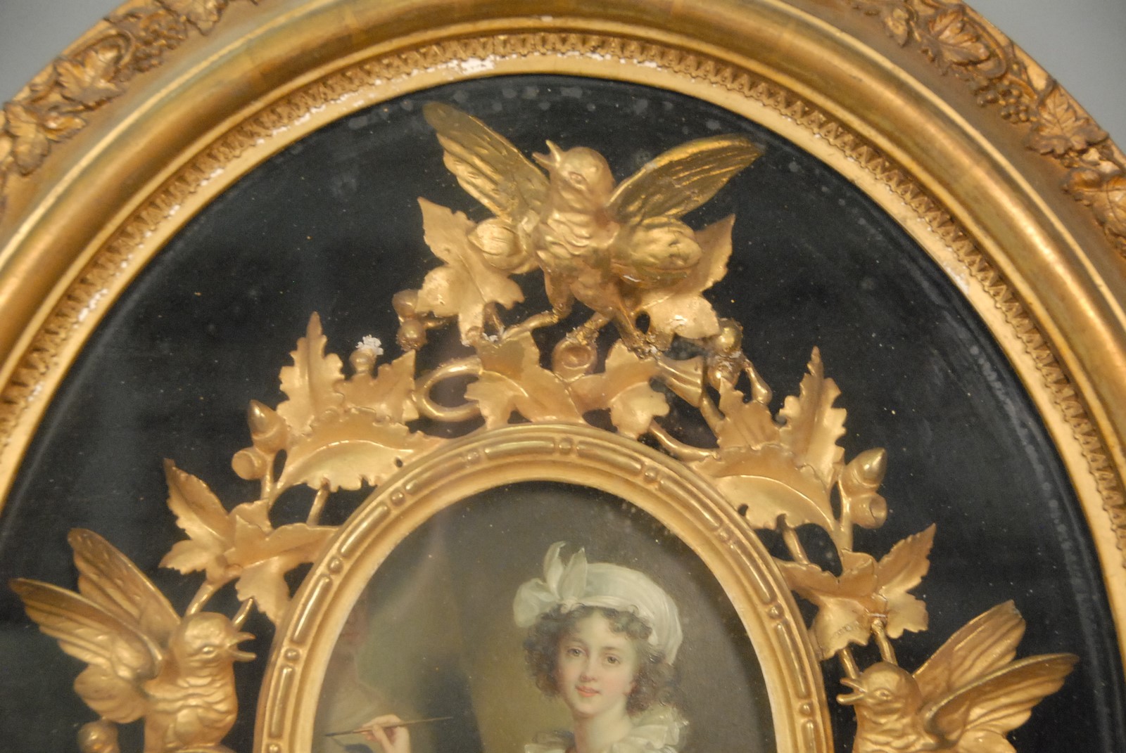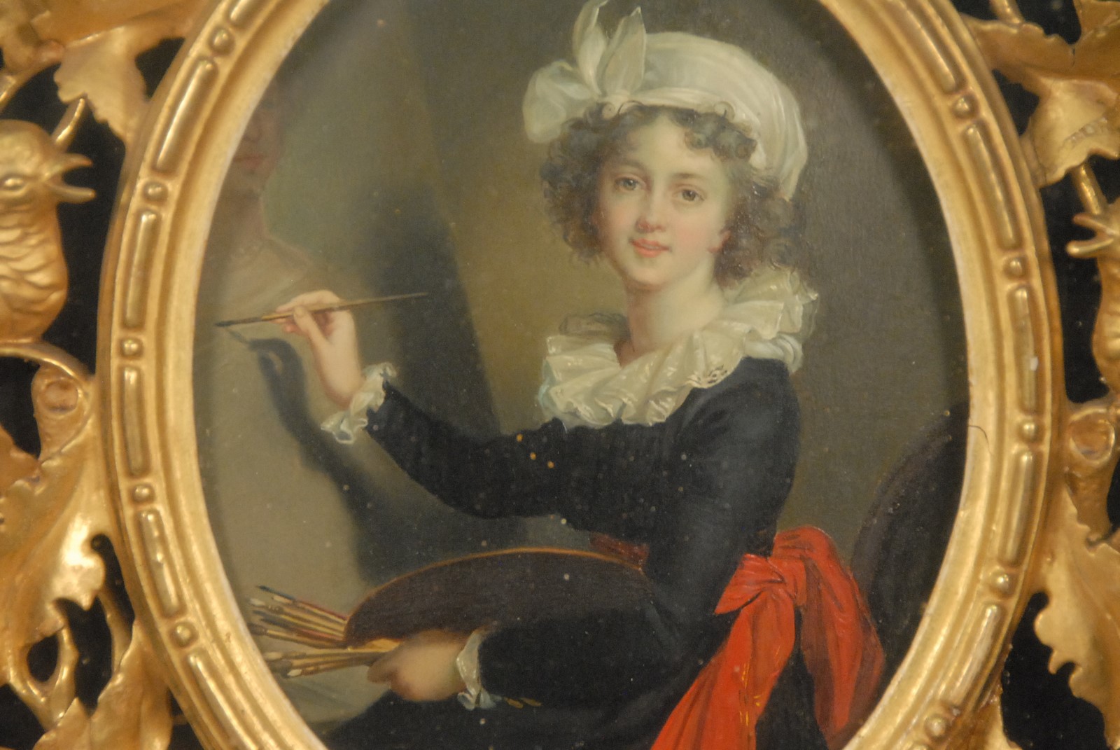 Lot 444: After Elisabeth Vigee Le Brun 1755-1842 MADAME LE BRUN portrait of herself oil on board unsigned marked on verso Mme Le Brun painting size: 8 1/2 x 6 1/2 shadow box size: 26 x 22