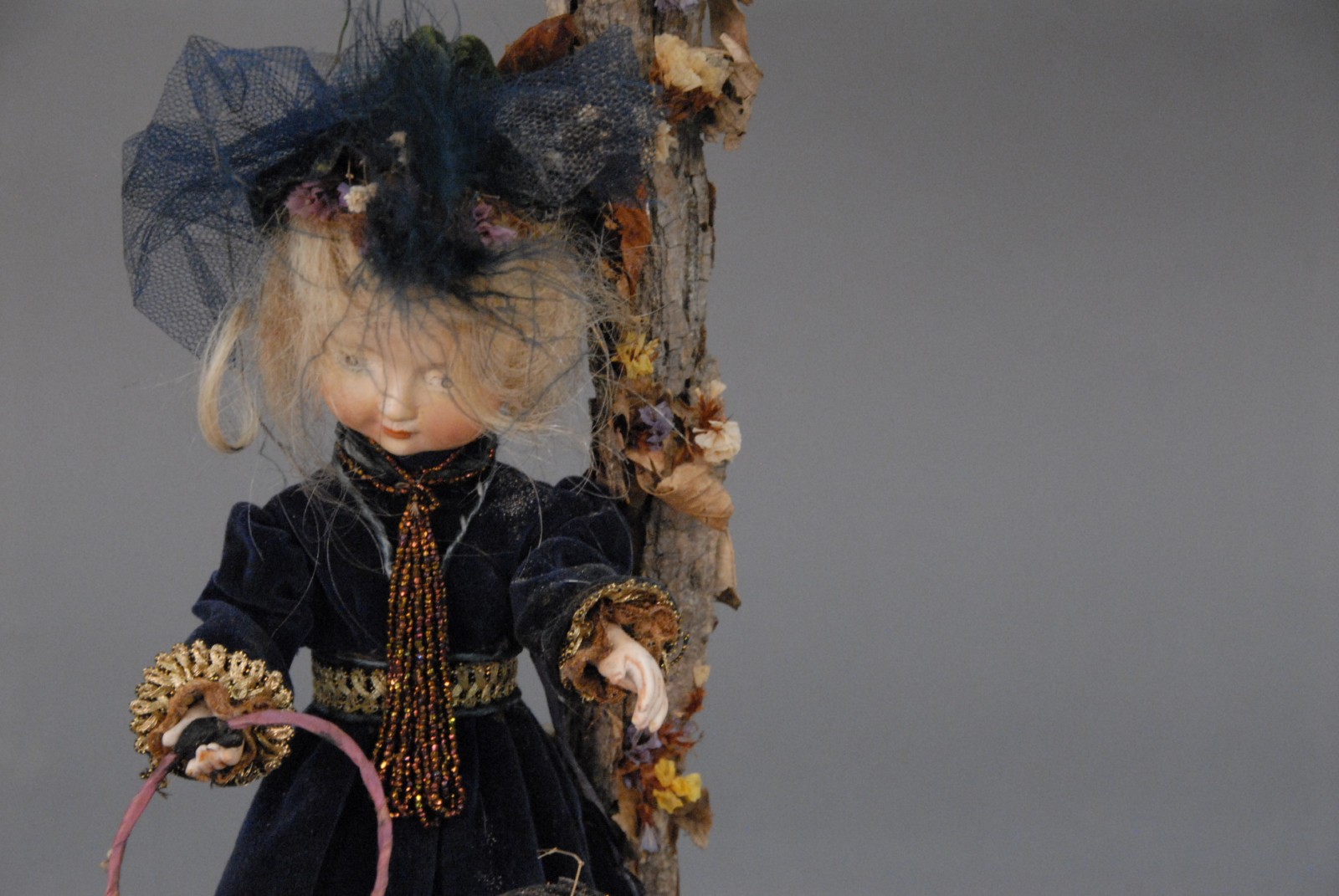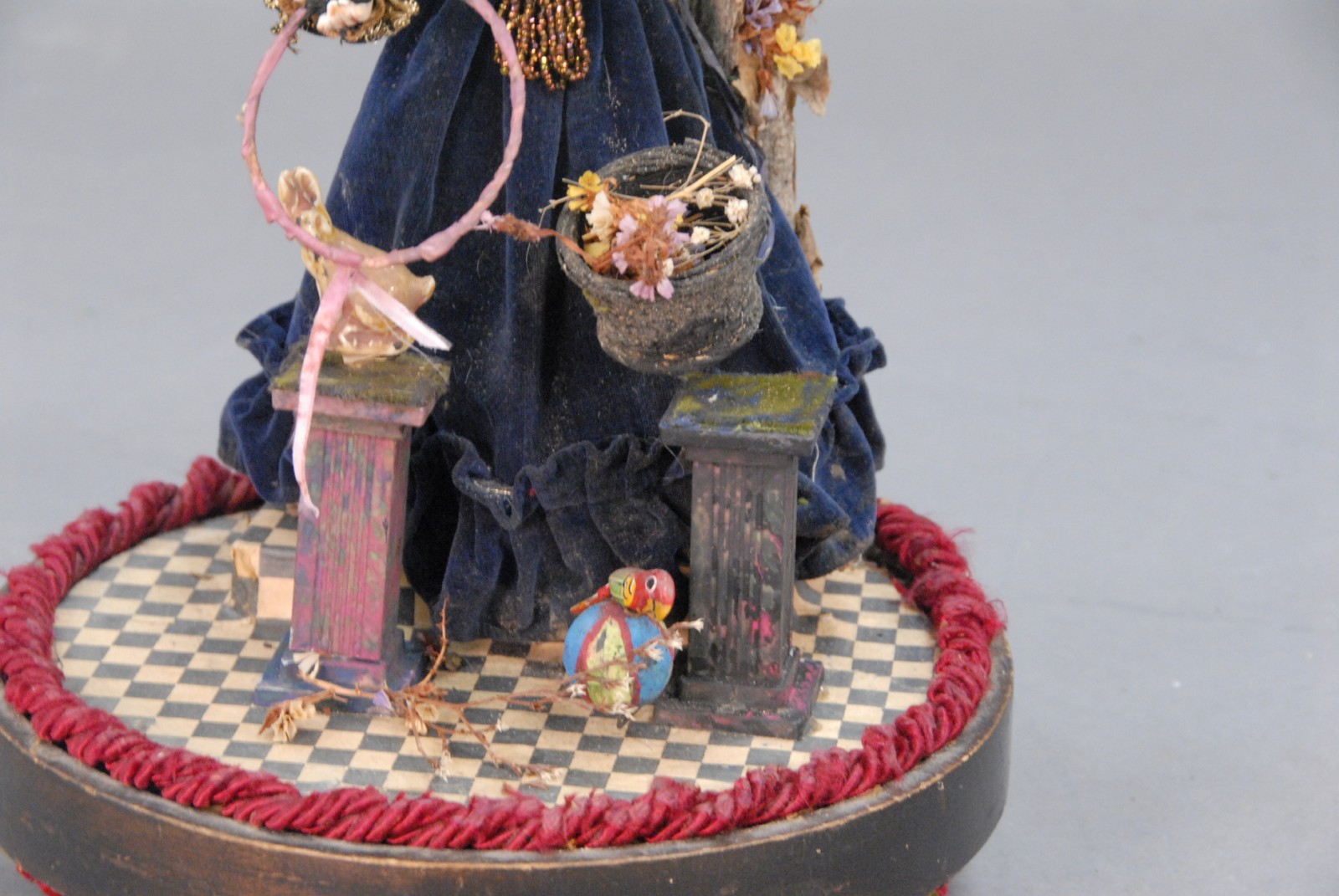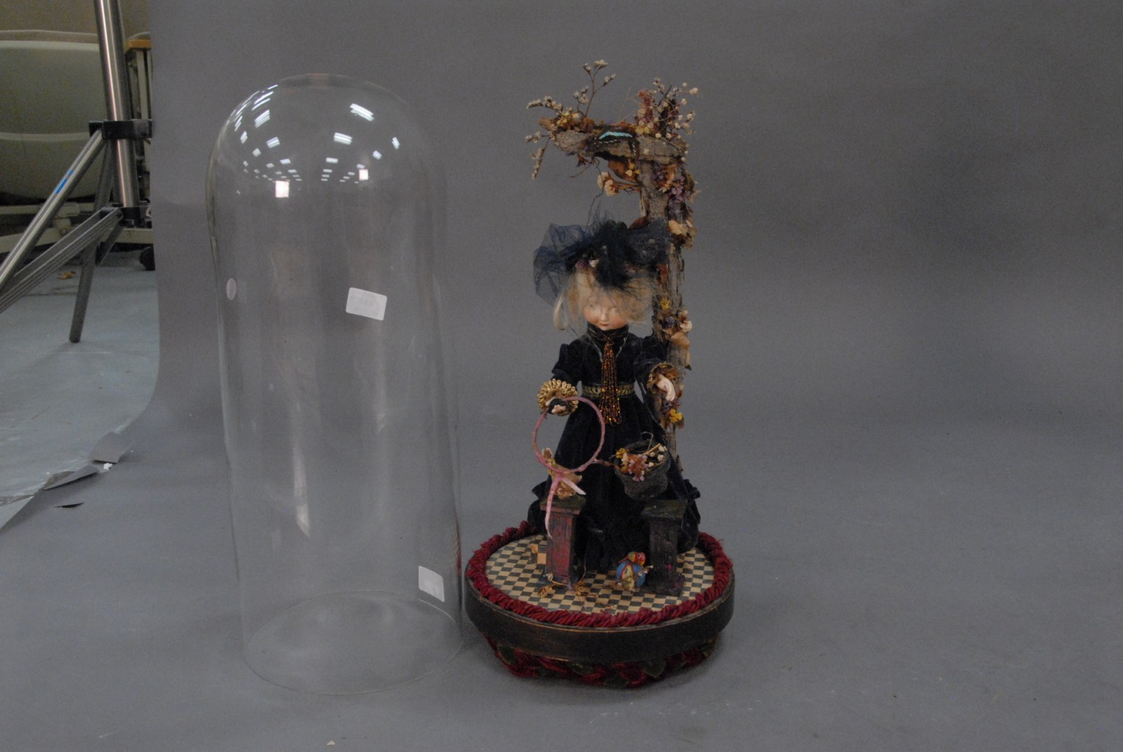 Automation doll under glass dome, girl with hoop and rabbit in working condition.