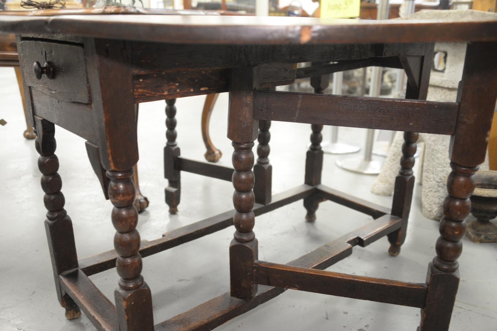 Lot 444: English Oak Gate Leg Drop Leaf Table, with drawer on block and turned legs, height 29 inches, open top 48 x 55.