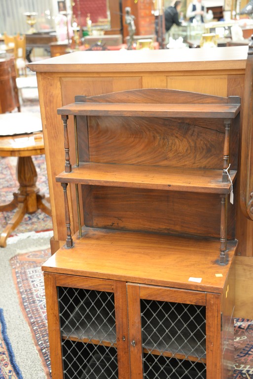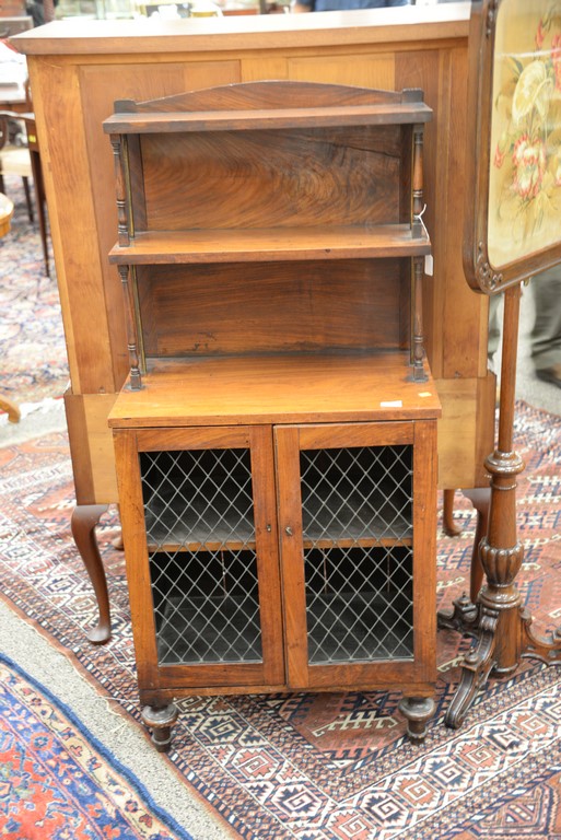 Lot 444: George III mahogany etagere / cabinet with two shelves over two grill work doors set on turned legs, early to mid-19th century. ht…