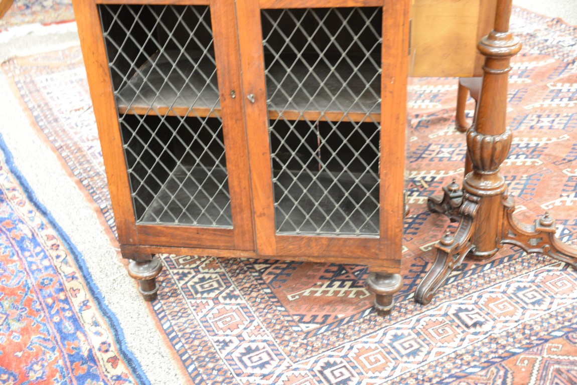 George III mahogany etagere / cabinet with two shelves over two grill work doors set on turned legs, early to mid-19th century. ht. 51 in. wd. 24 in. dp. 15 in. Provenance: The Estate of Natalie Rafferty