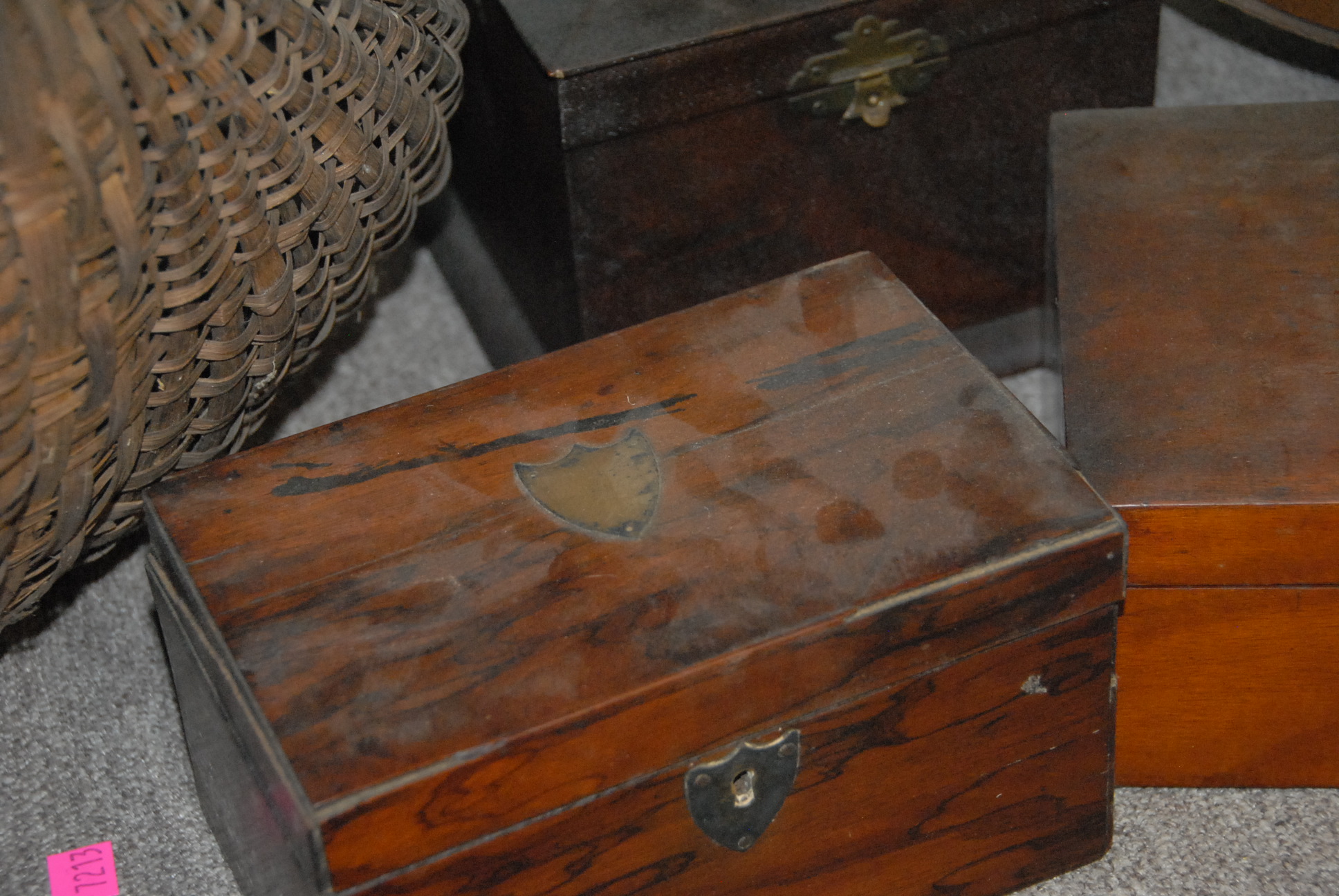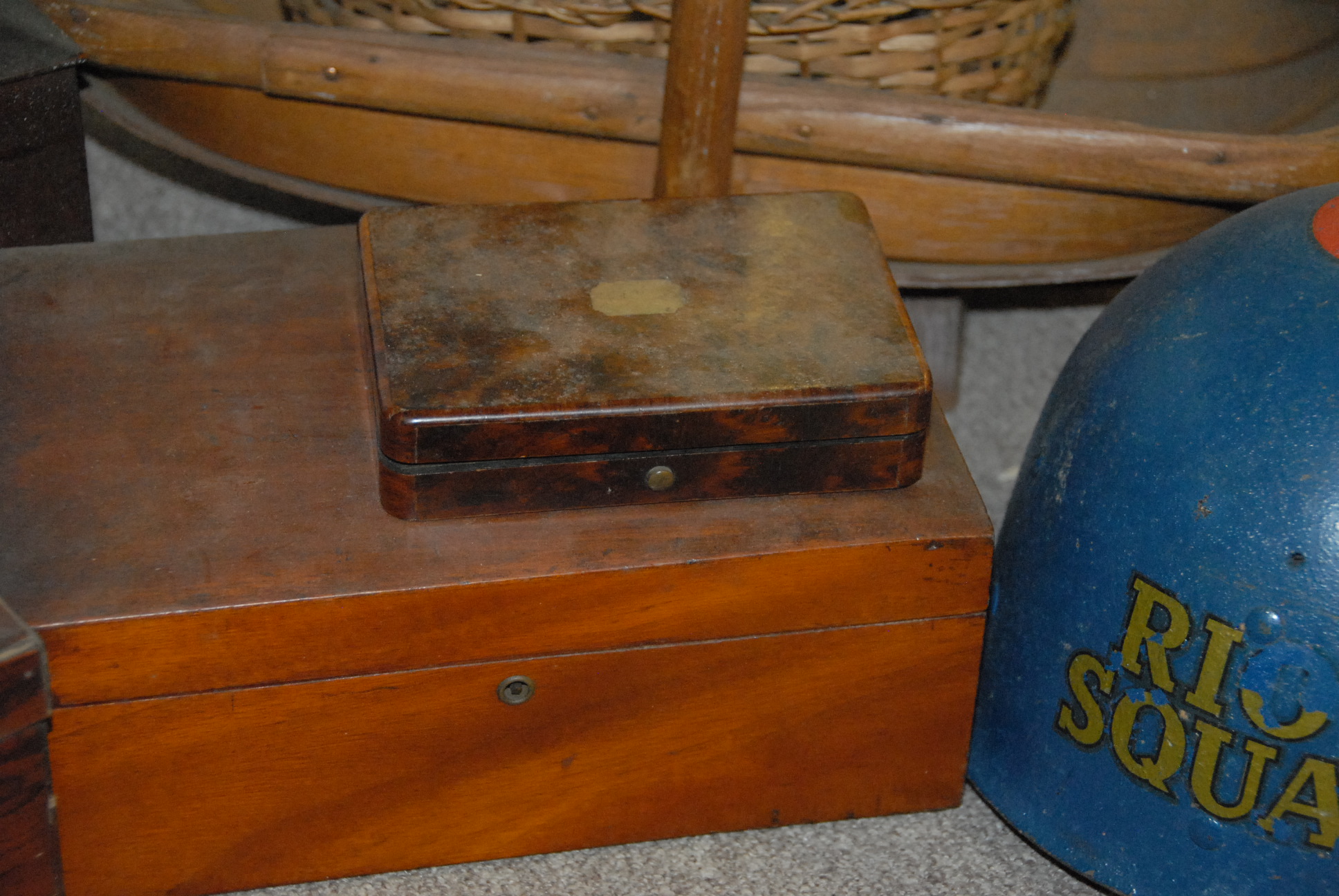 Group of four baskets, four boxes, and one Riot helmet.