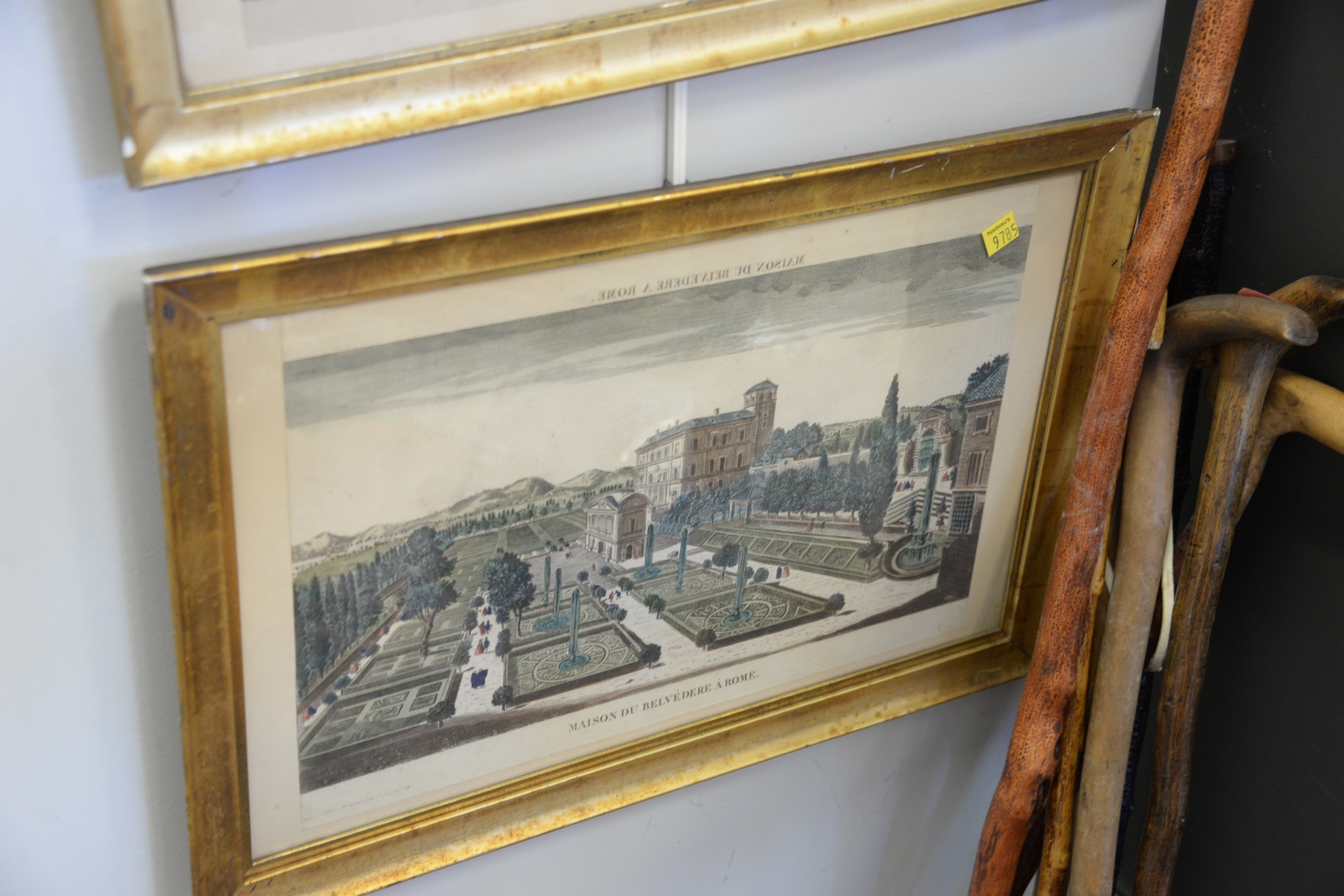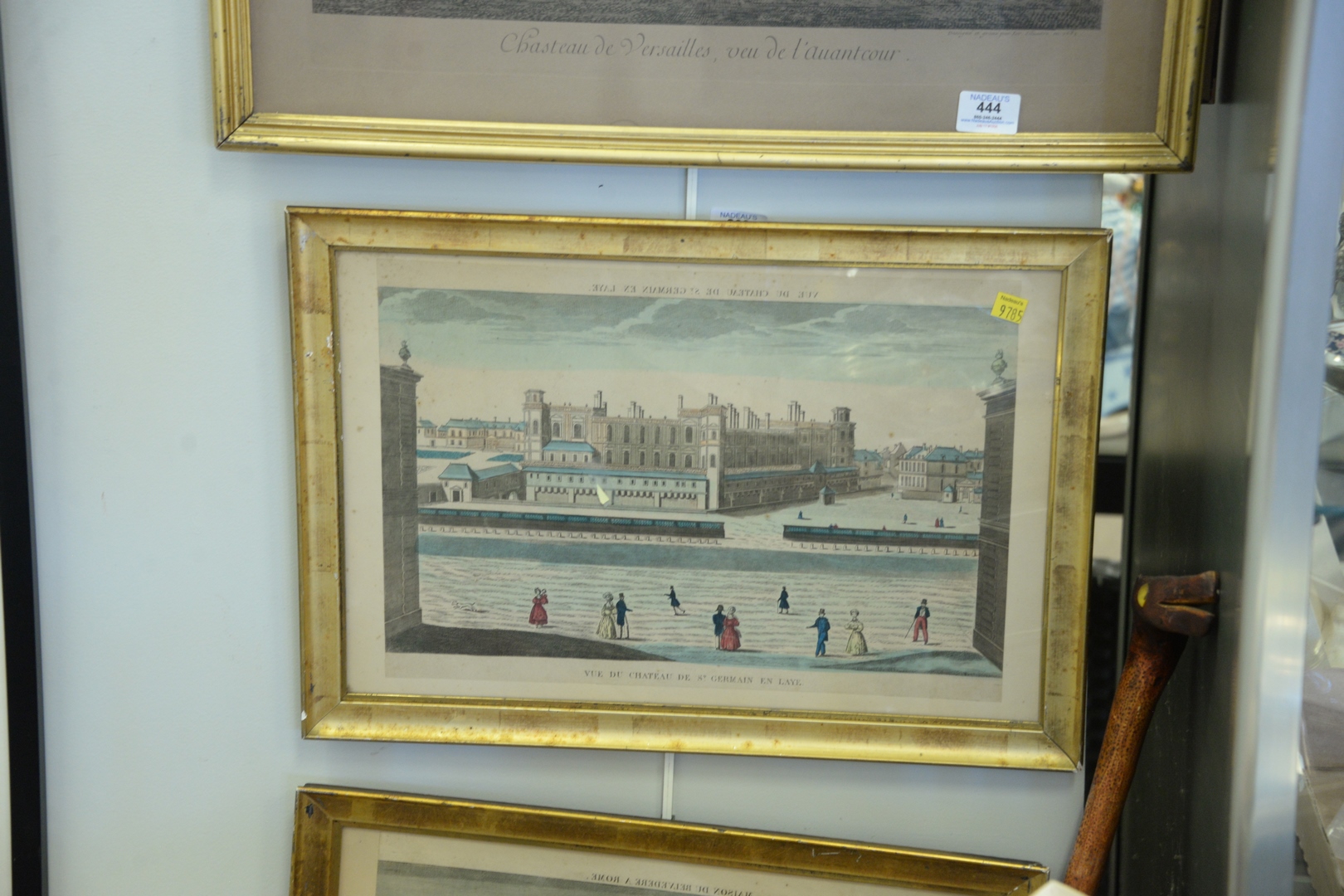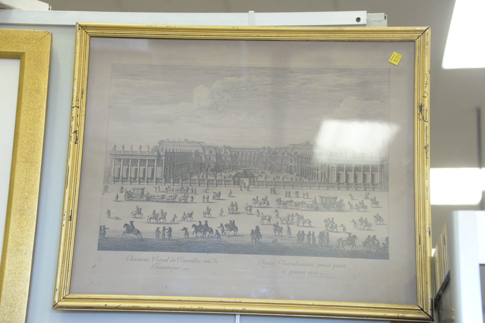 Lot 444: Group of Four Vue D’Optique Engravings, to include two by Israel Silvestre, “Chasteau Royal de Versailles, veu de l’avant-cour”, “Chasteau de Versailles, vue de l’avant cour”; along with two hand colored engravings, “Vue de Chateau de St. Germain en laye” and “Maison du Belvedere a Rome”; largest image 13 1/2″ x 19 1/4″.
