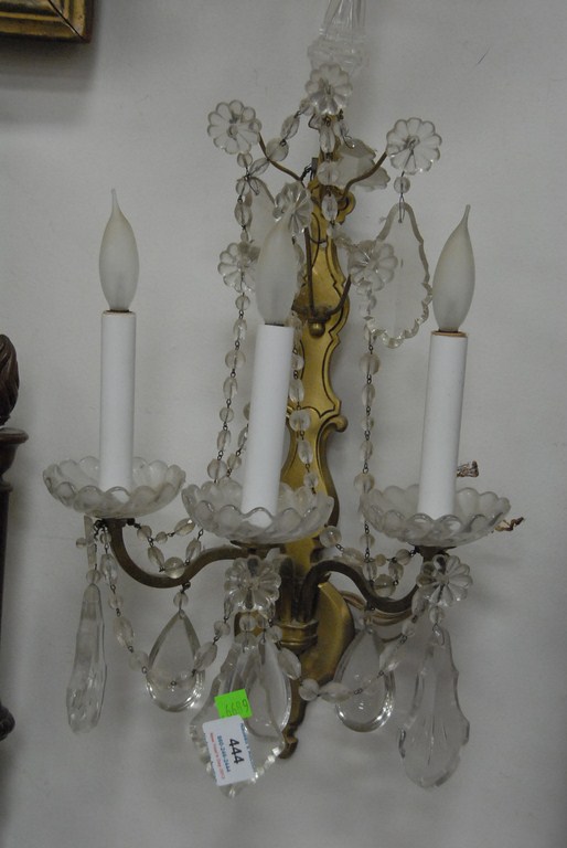 Lot 444: Pair of brass and crystal sconces each with three lights. Provenance: From prominent Woodbridge, Connecticut family collection.