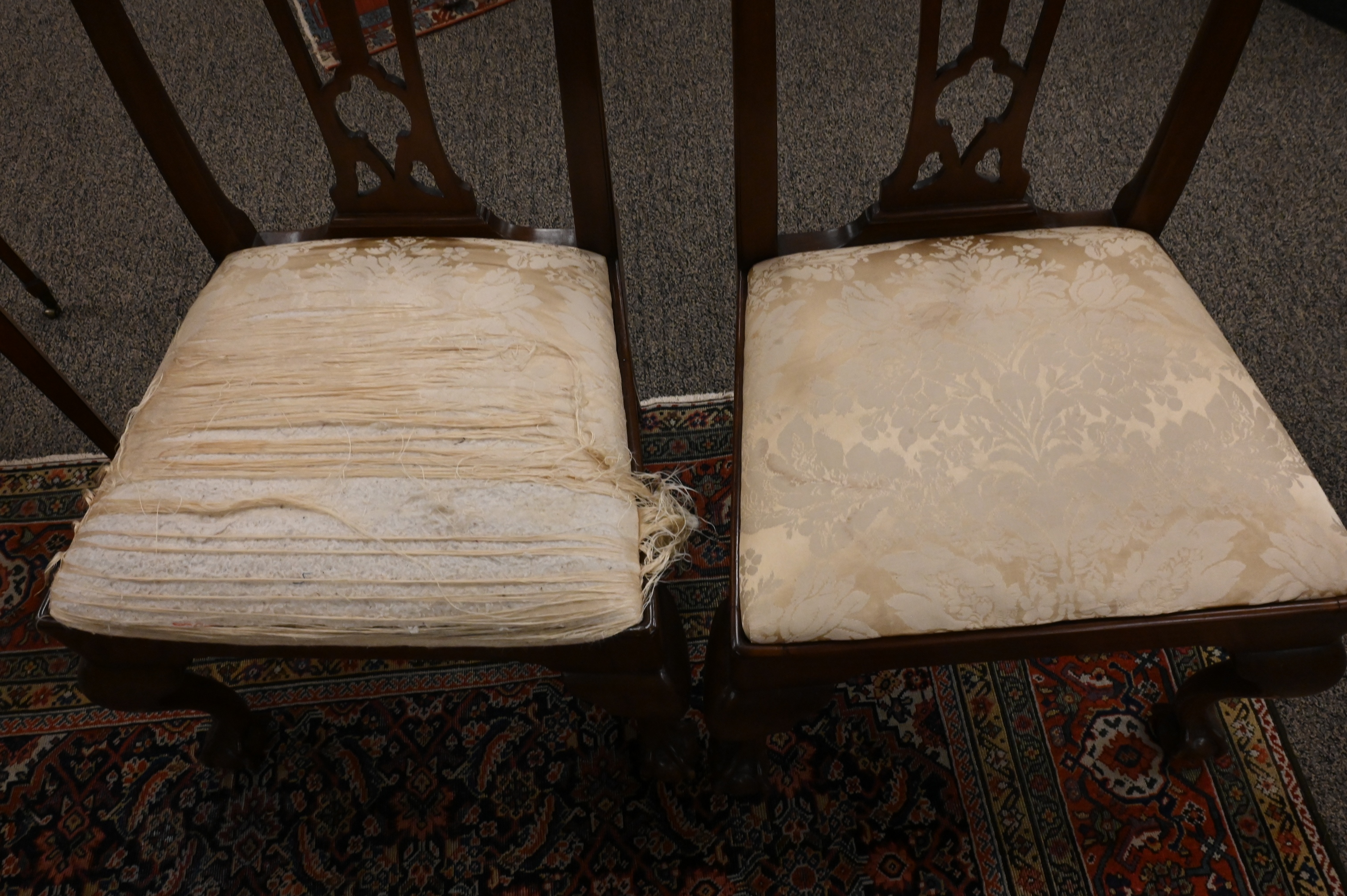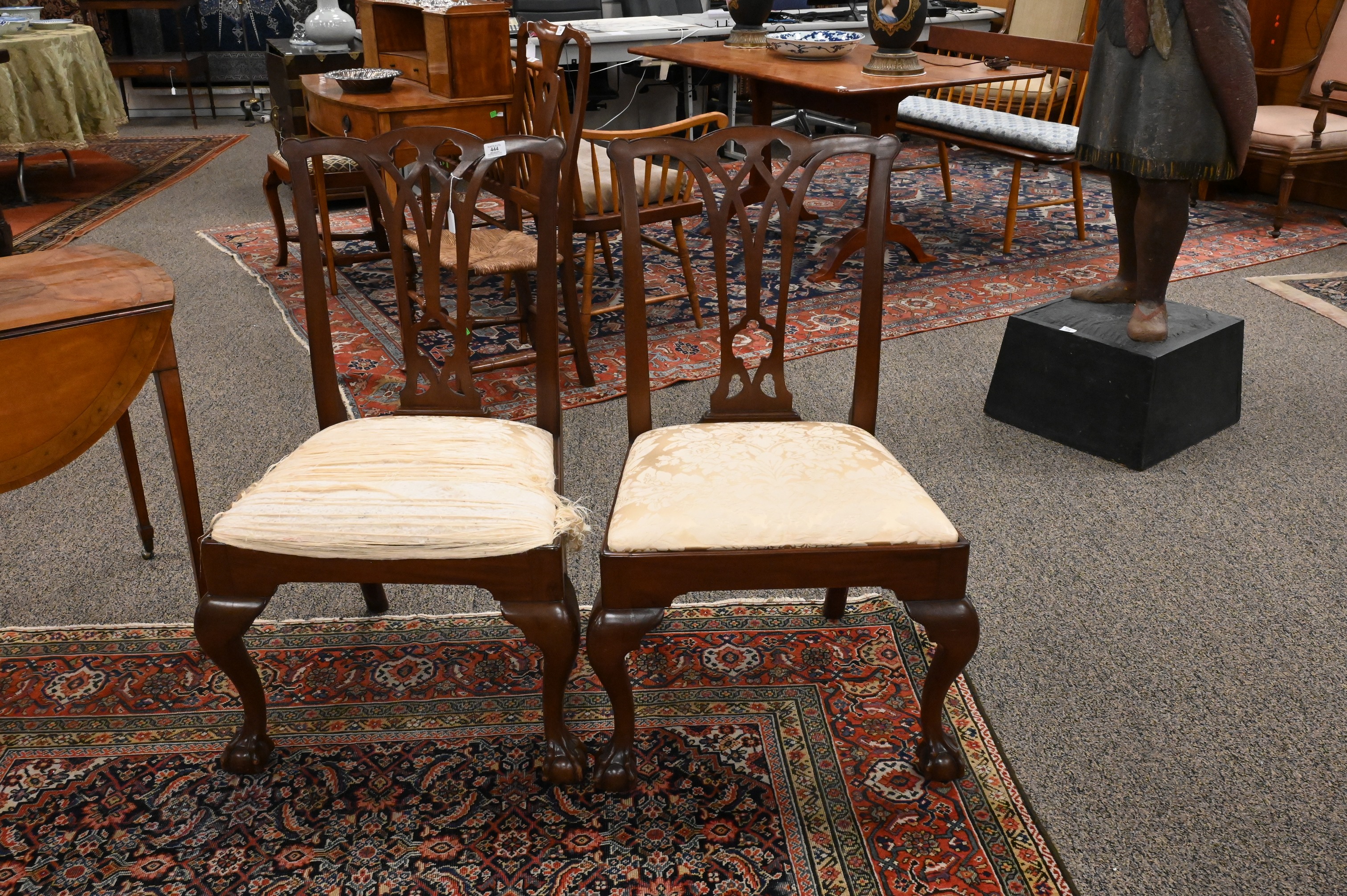 each with an undulating top rail above a pierced splat needlework slip seat with worn silk slip seat covers, on a plain apron and cabriole legs terminating in ball and claw feet, interior of the rear seat rail of the chairs numbered in chalk 3 and 4, Philadelphia, late 18th Century
