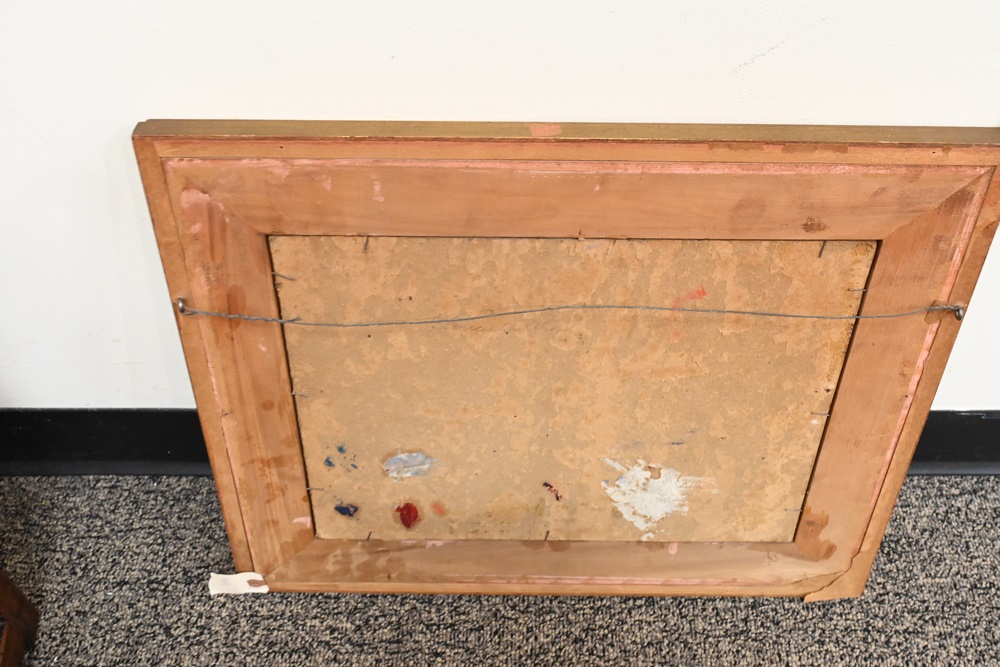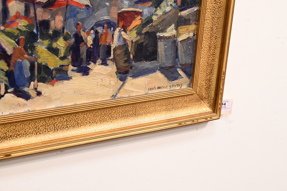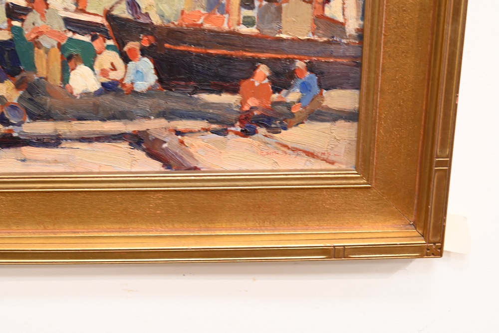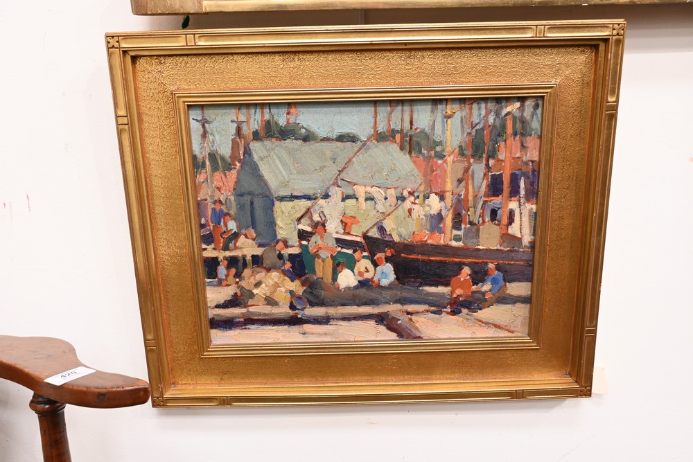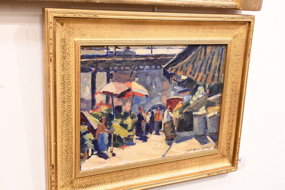 Lot 444: Pair of Edith Briscoe Stevens American, 1898 – 1931 market scene and pier scene both oil on board both signed lower right “Edith Briscoe Stevens” both 12 x 16 inches Provenance: Fifty Year Personal Collection of Clocks and American Antiques from Thomas Bailey, Manchester, Connecticut.