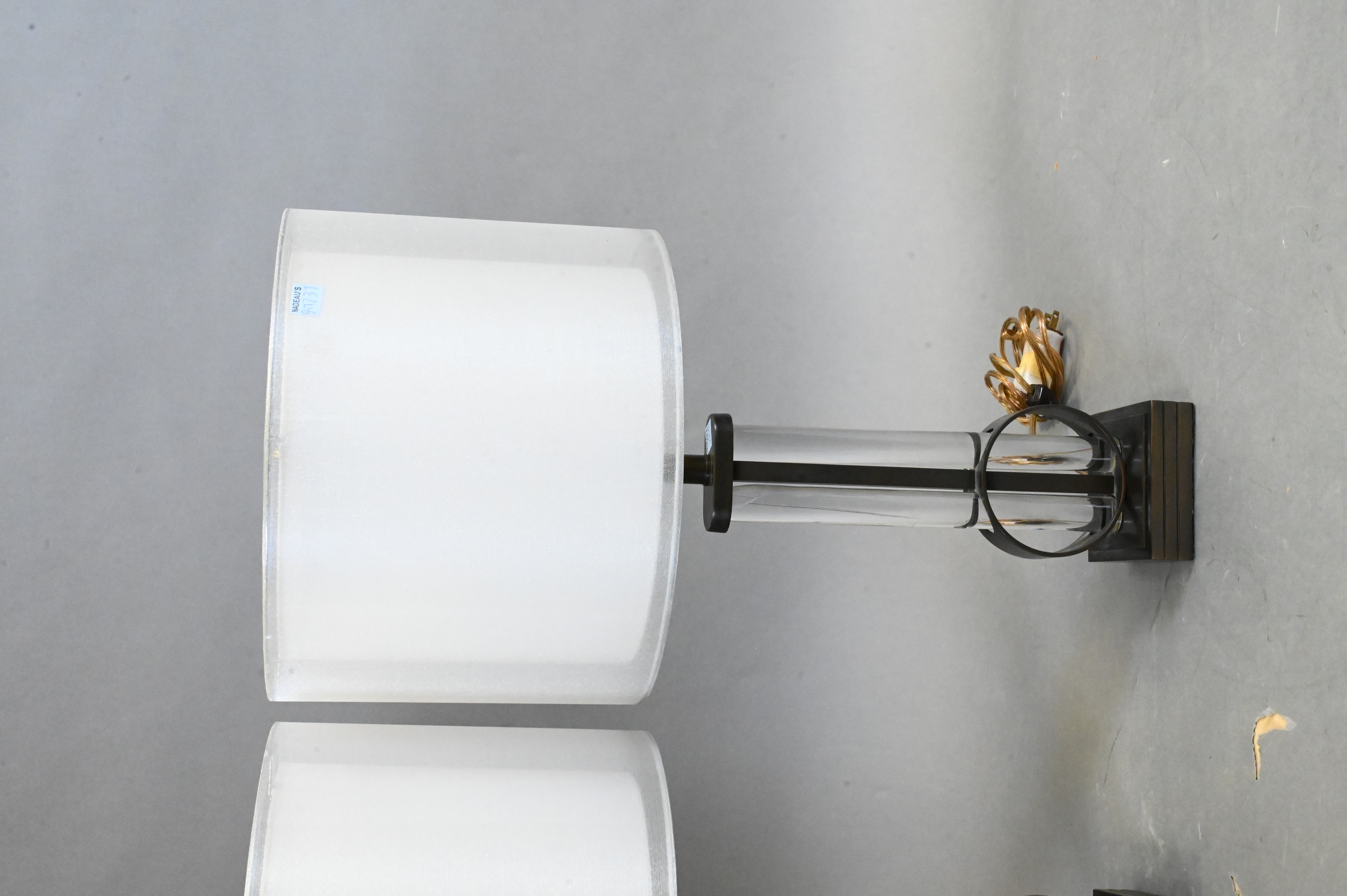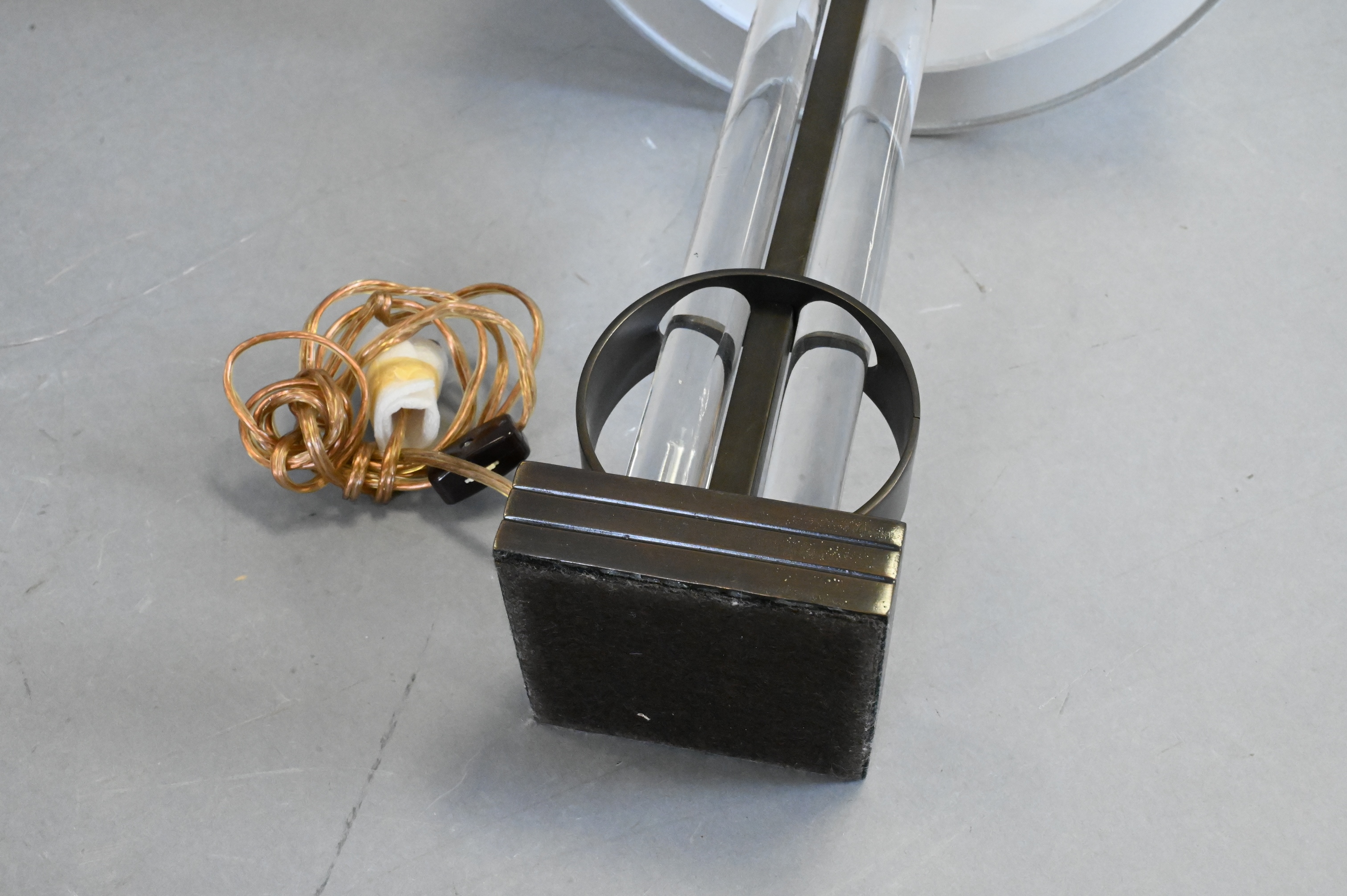 having brass body, two glass rods secured by round brass over square platform base, custom shades