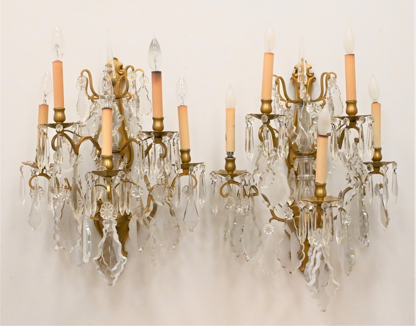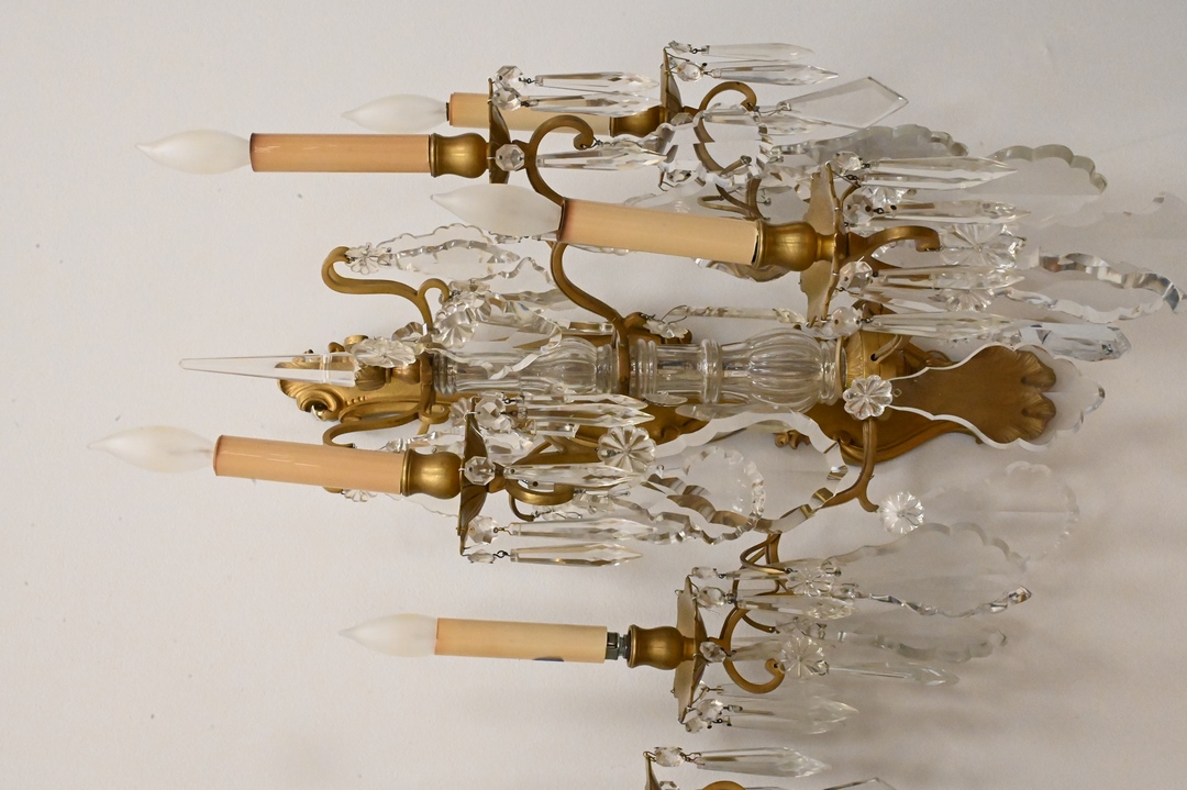 Pair of Gilt Bronze and Cut Glass Five Light Sconces