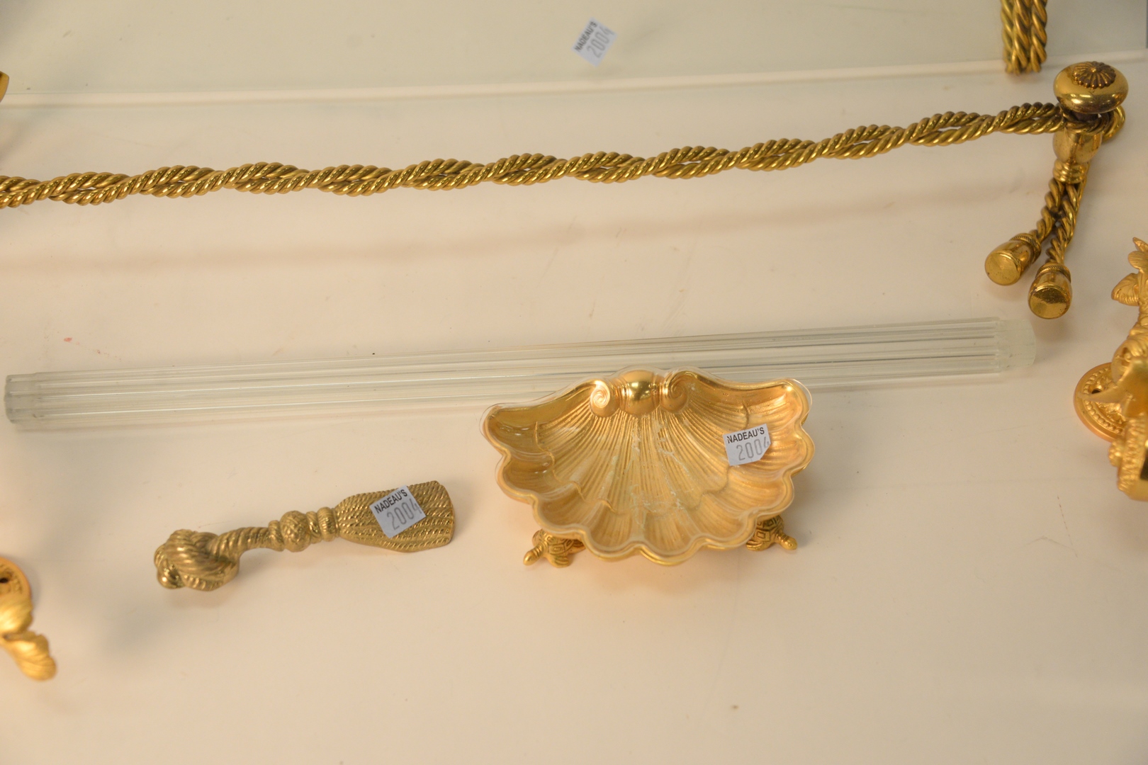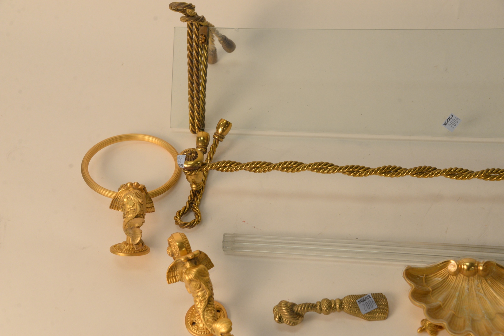 Seven Piece Lot of Bathroom Hardware, attributed to Sherle Wagner, to include two towel racks; one towel ring; one glass shelf; a shower head; along with a soap dish. Provenance: The Estate of Alina Roisen, Park Avenue, New York.