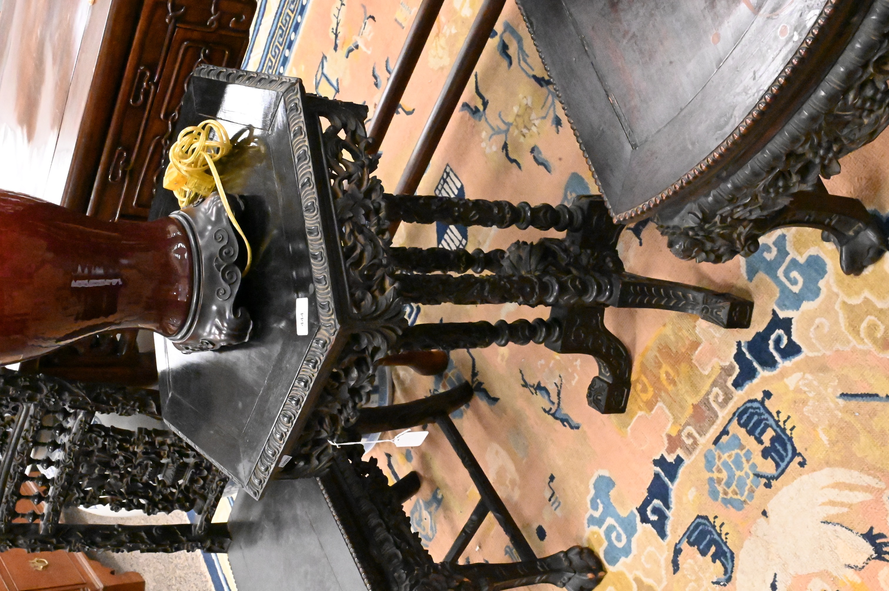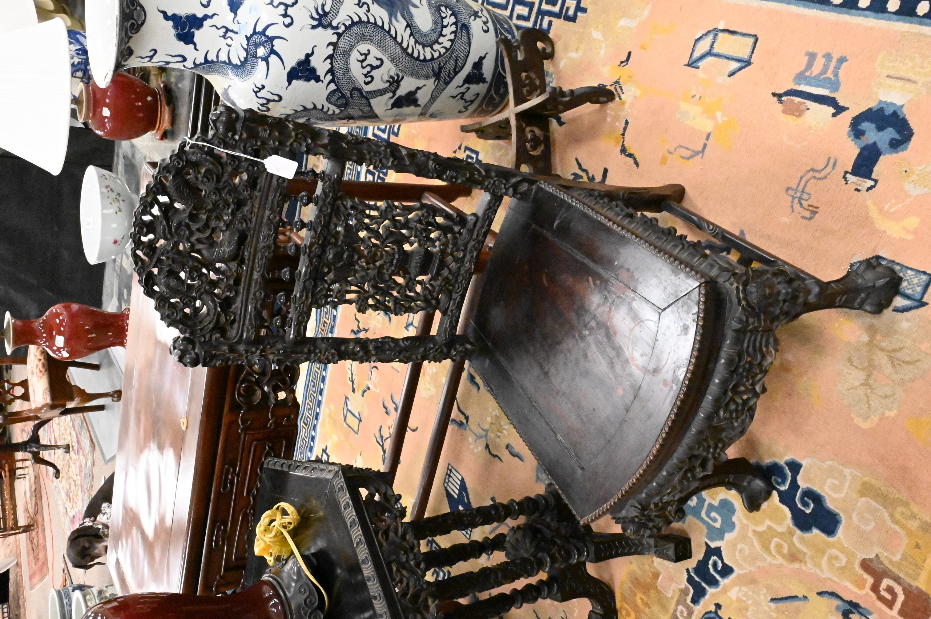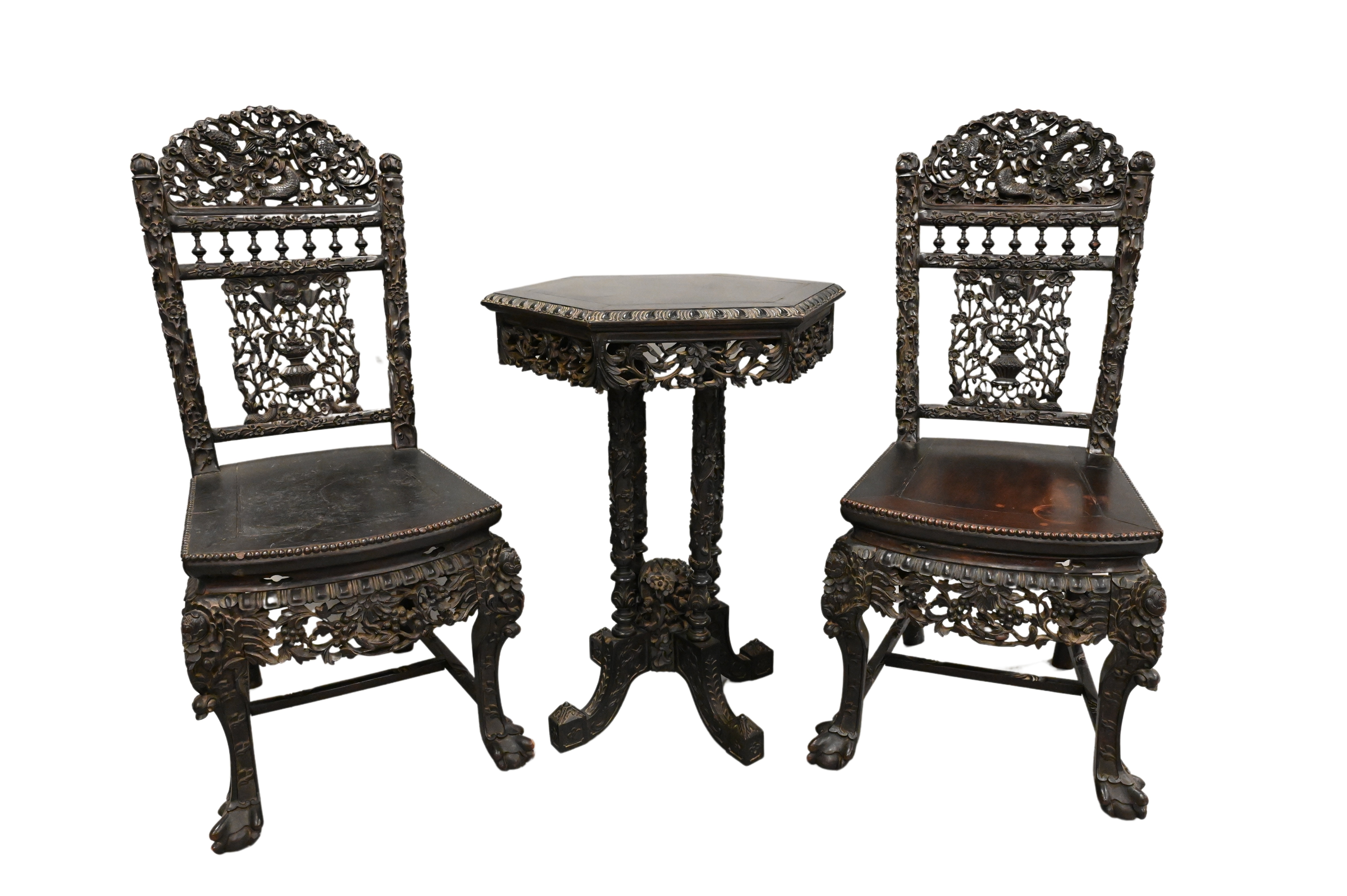 two side chairs having pierce carved dragons and urns of flowers along with six sided table with basket of flower finials