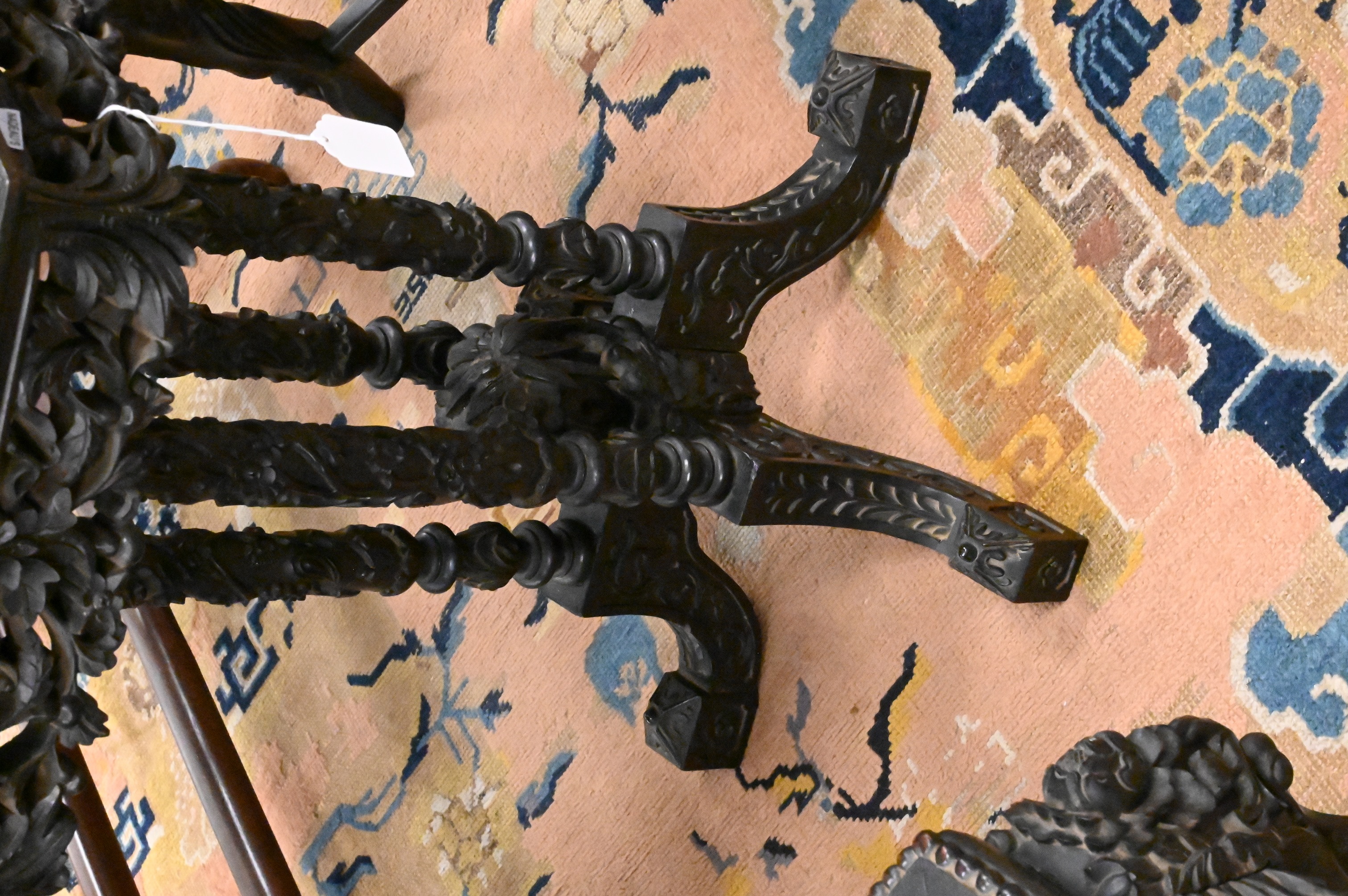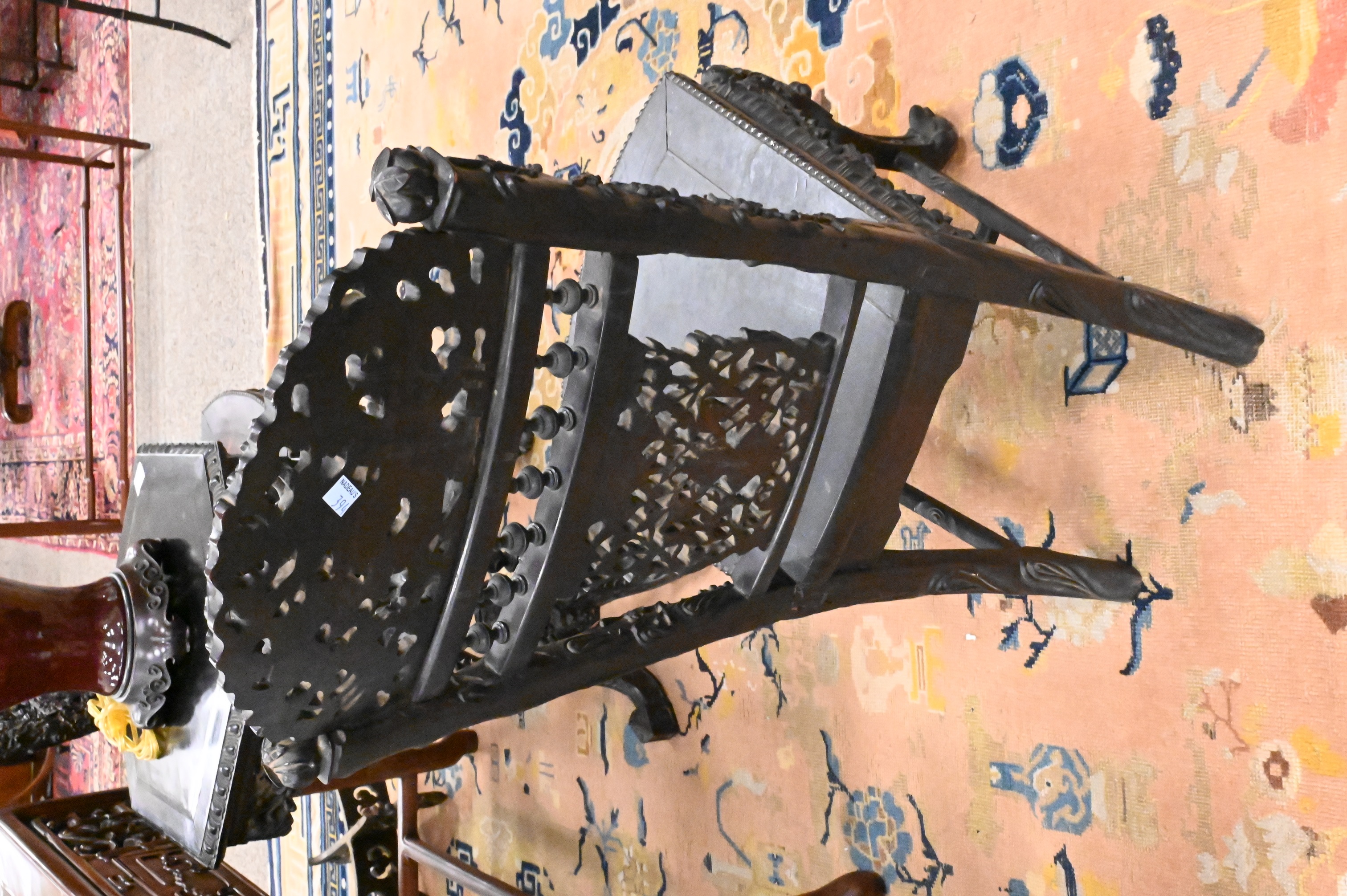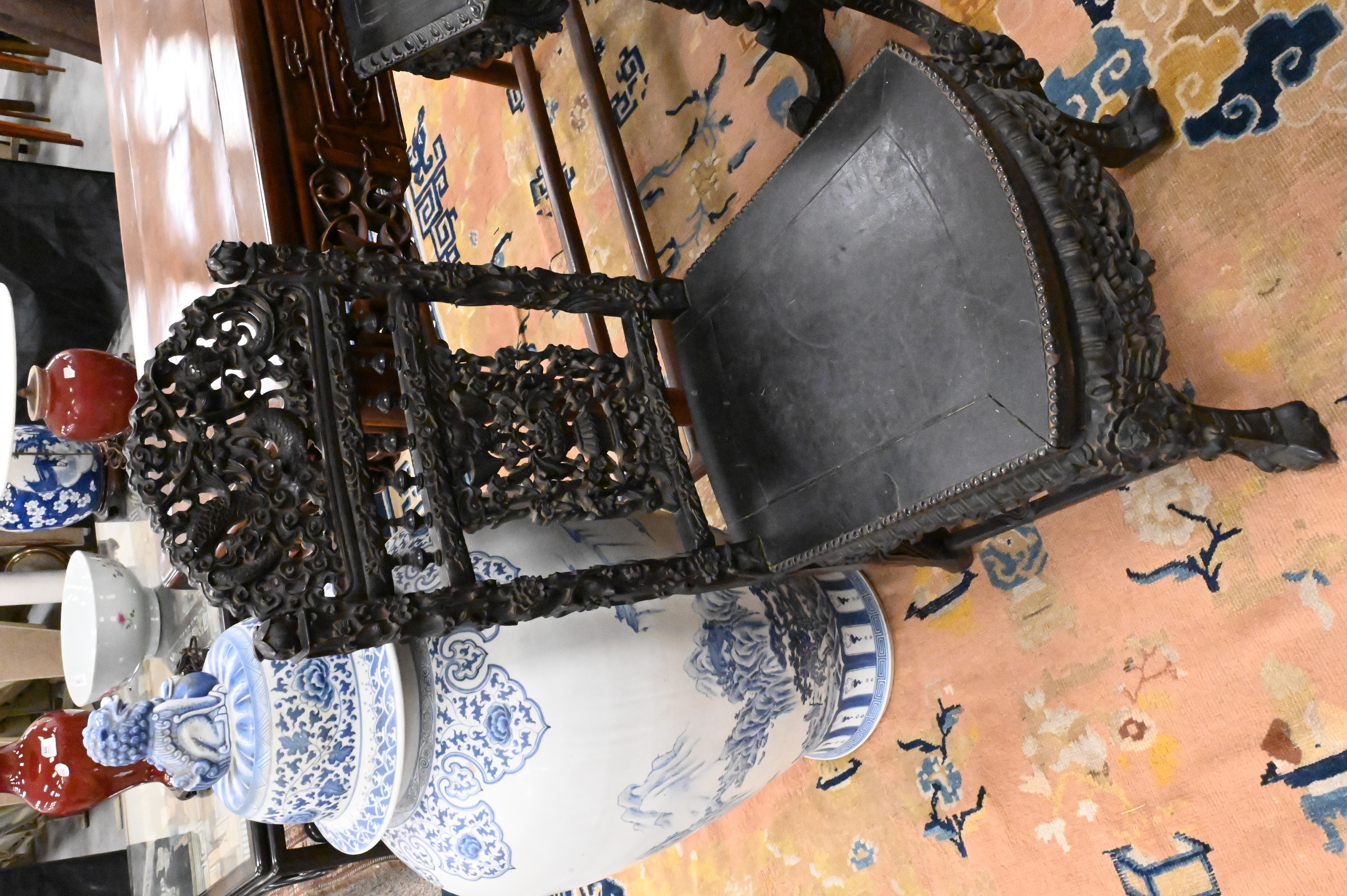 two side chairs having pierce carved dragons and urns of flowers along with six sided table with basket of flower finials