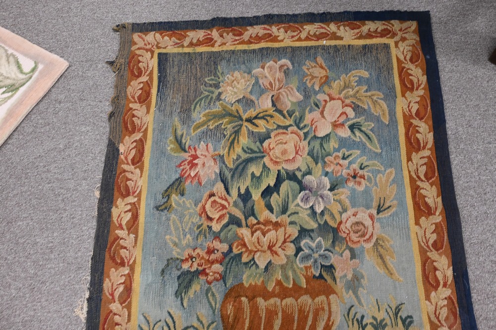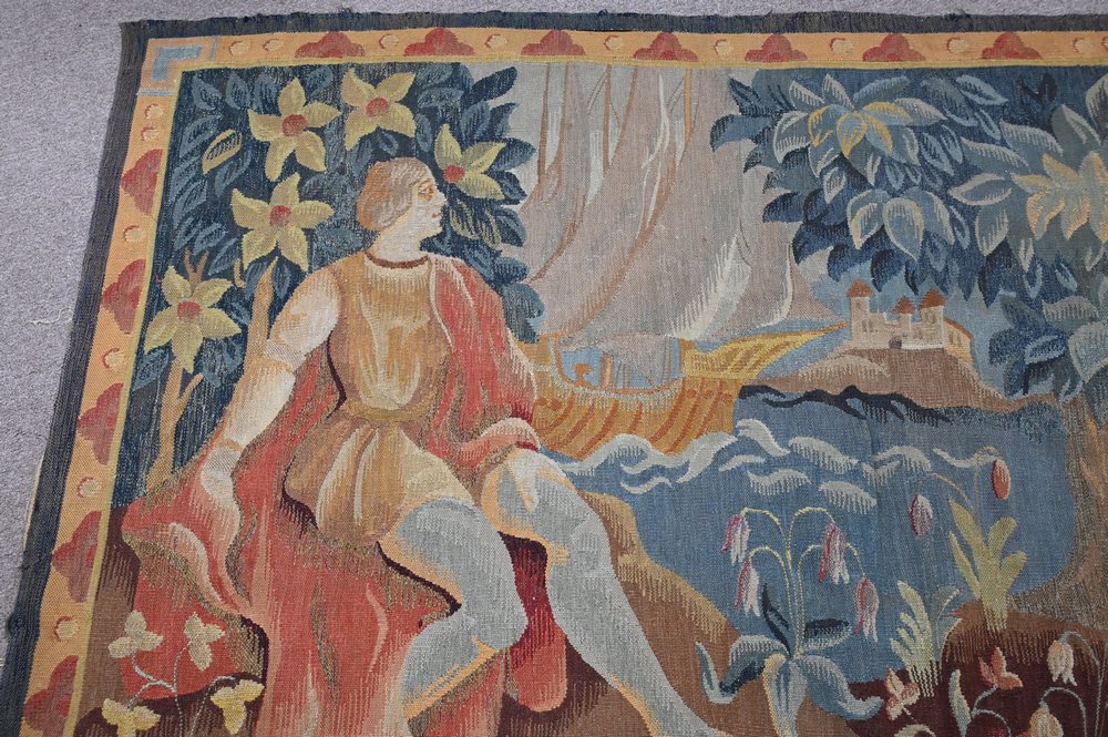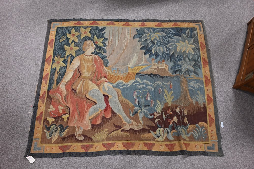 Lot 444: Two Continental Flat Weave Throw Rugs, to include one depicting basket of flowers, the other with classical scene with figure, boot,…