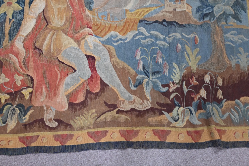Two Continental Flat Weave Throw Rugs, to include one depicting basket of flowers, the other with classical scene with figure, boot, and castle; 4′ 1″ x 5′ and 2′ 5″ x 3′ 7″.