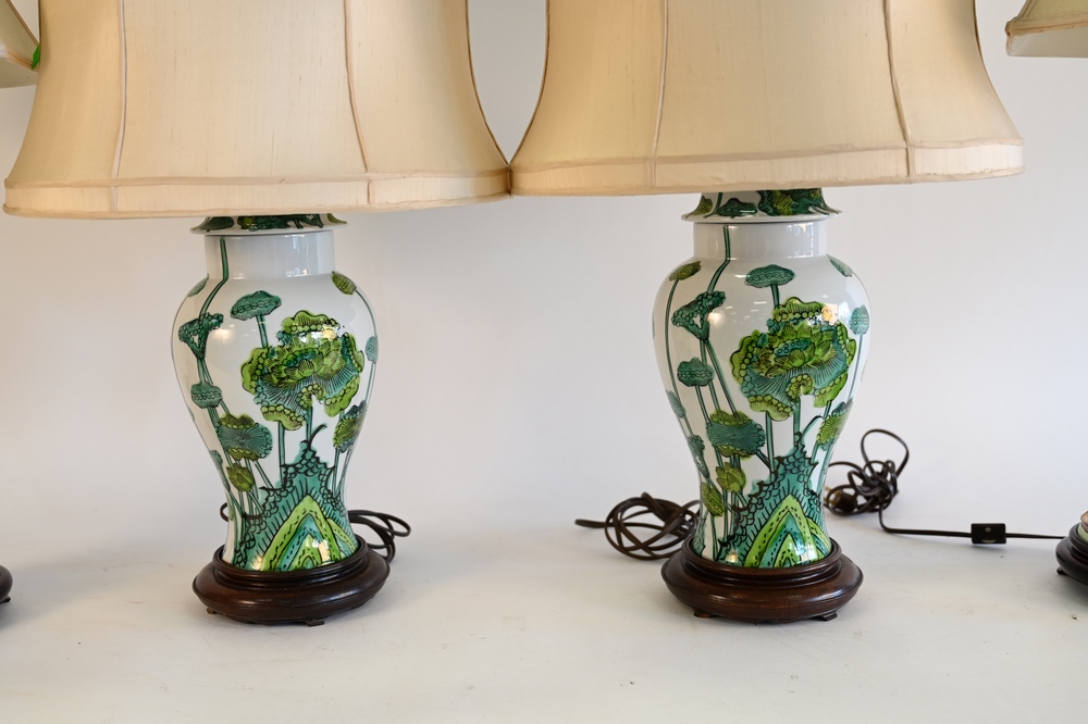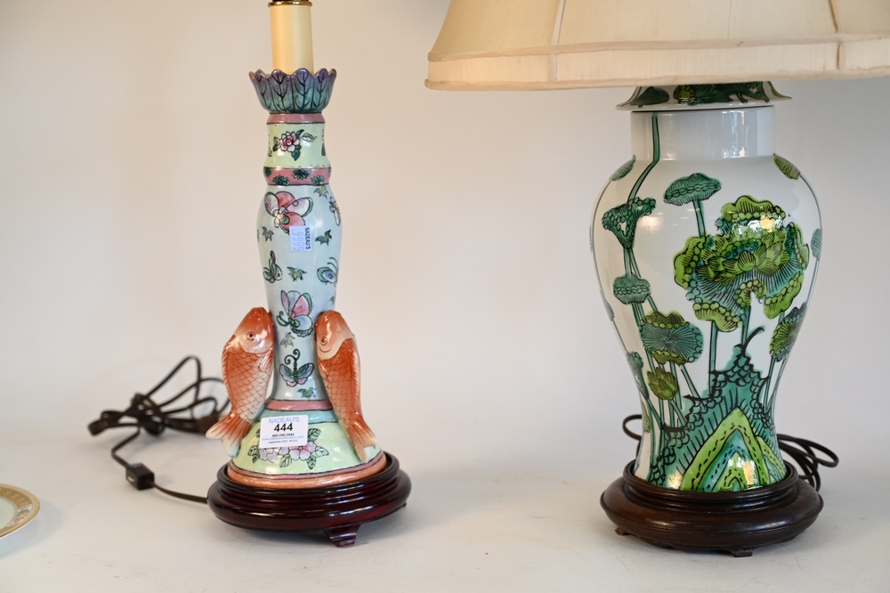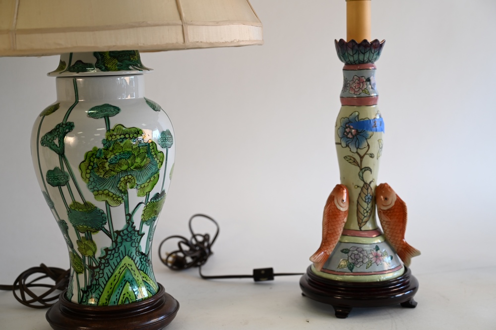 Lot 444: Two Pairs of Asian Style Table Lamps, to include a pair having koi fish forms mounted to the shaft, along with a pair having green and blue foliate motif, overall height 30 inches.
