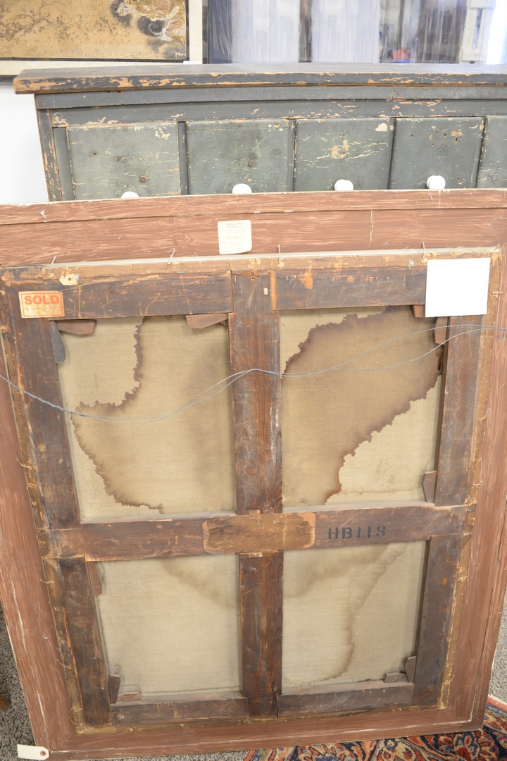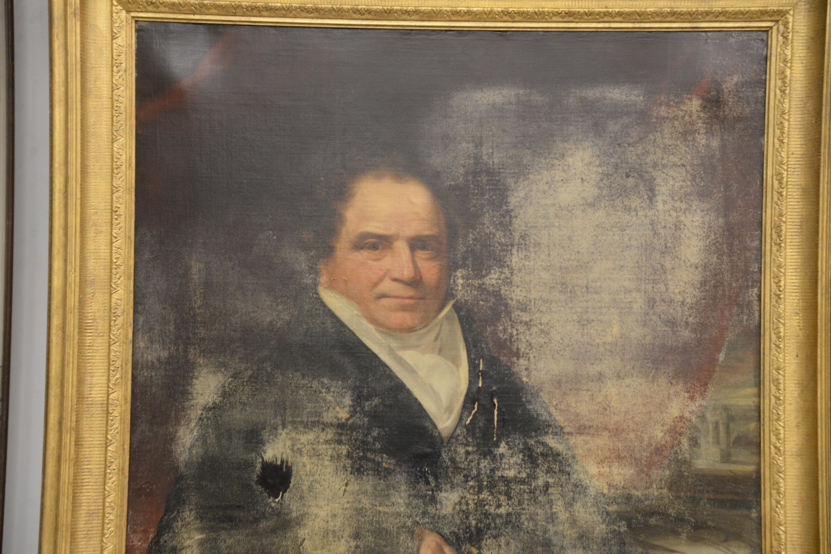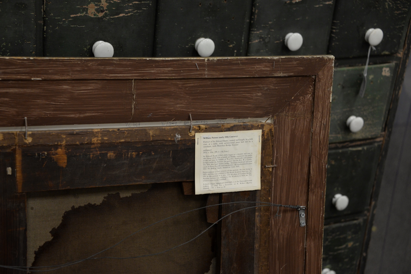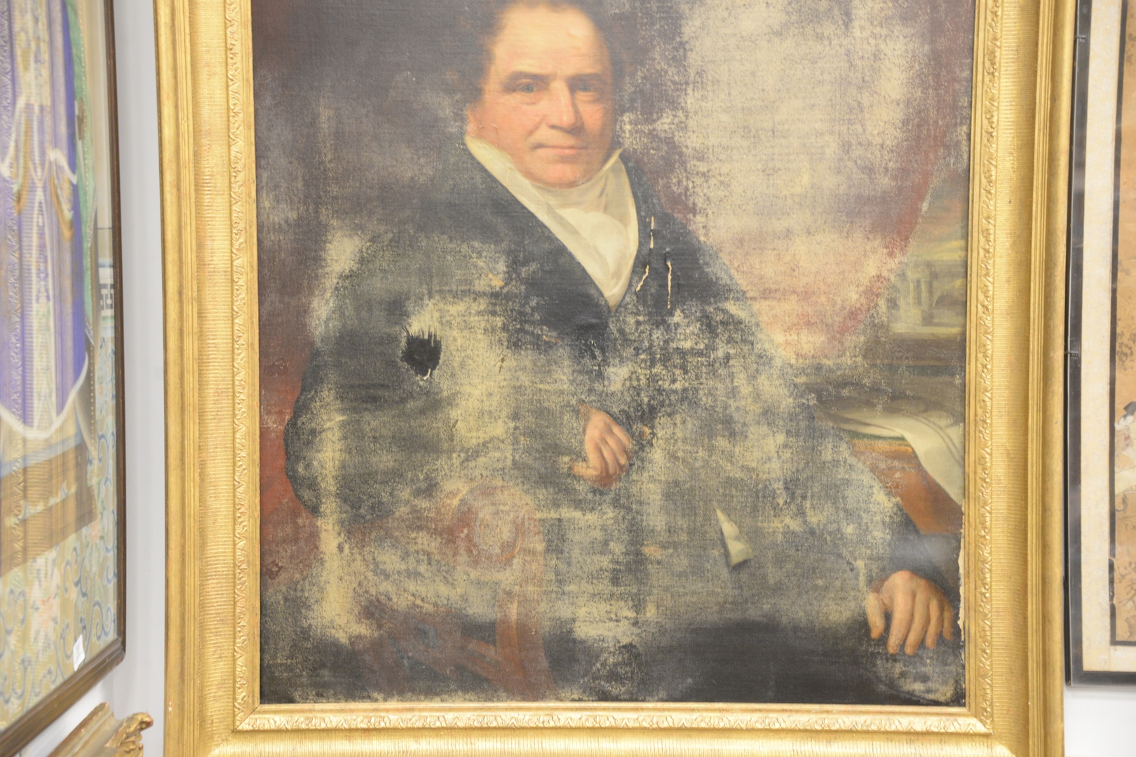 Lot 444: William Patten British, circa 1793 – 1843, Sir Edwards Banks, architect with plans for Waterloo Bridge, circa 1820’s, oil on canvas, unsigned, as is with heavy paint loss throughout and water damage, 39 x 32.