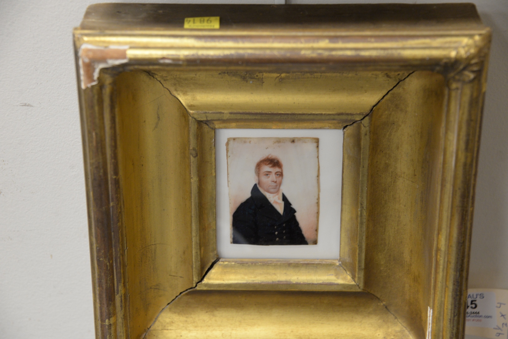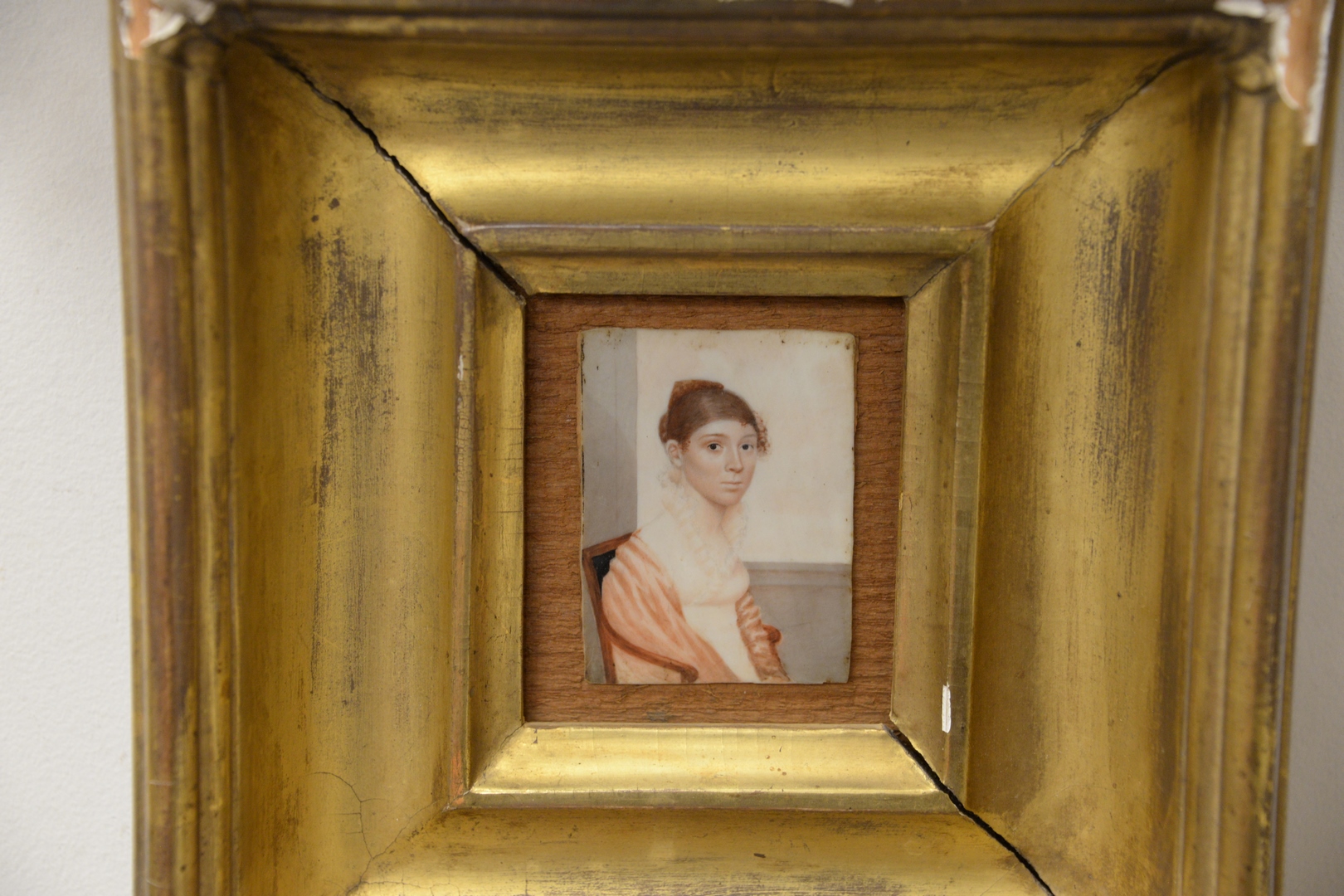American School early 19th Century Pair of Primitive portraits of a man and a woman, watercolor, in deep gilt frame, image 3 x 2 1/4.