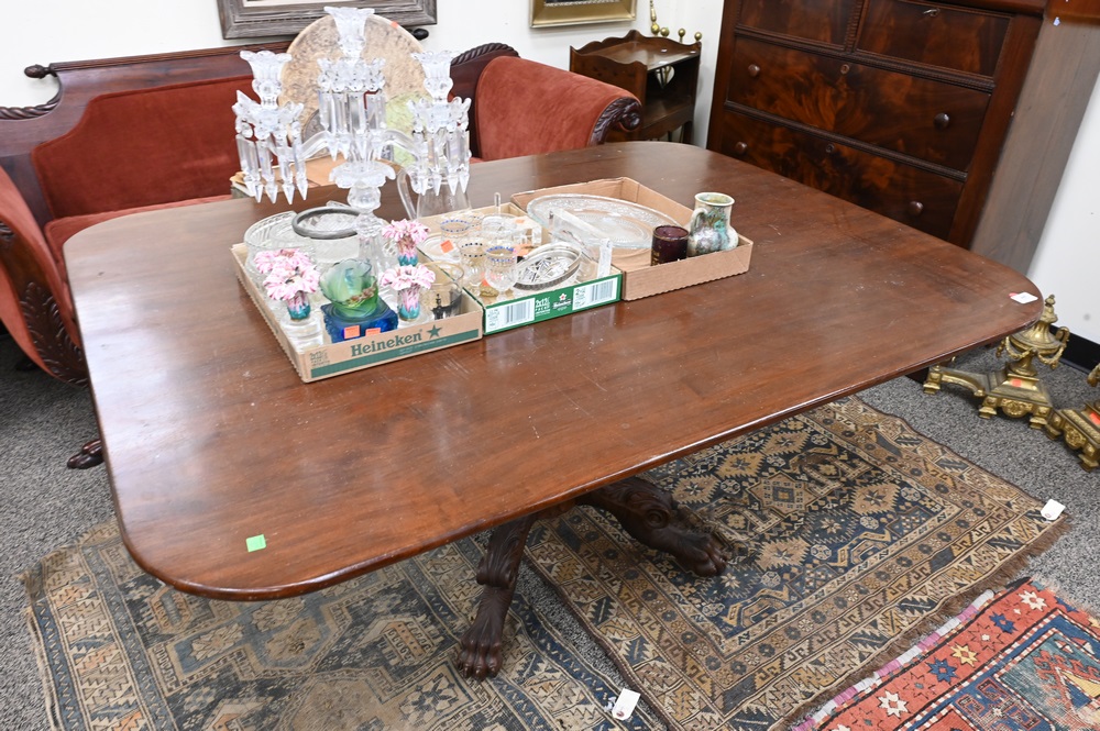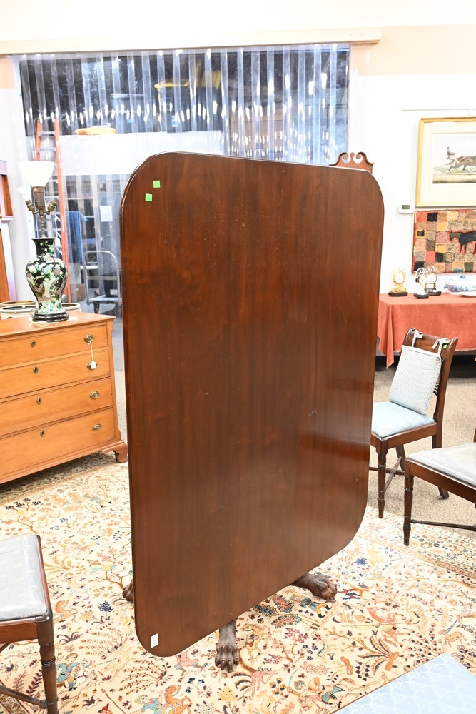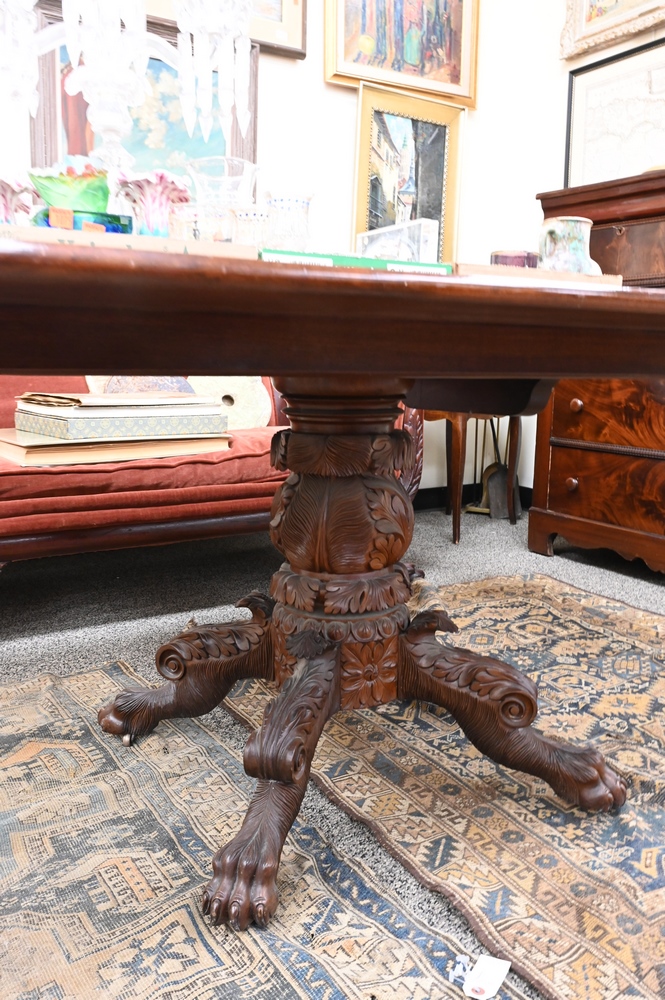 Lot 445: Federal Mahogany Breakfast Top Table, having rectangular top on intricately carved base, set on carved paw feet, single board top, circa 1840, probably New York, height 29 inches, top 29 inches, top 48 x 60 inches