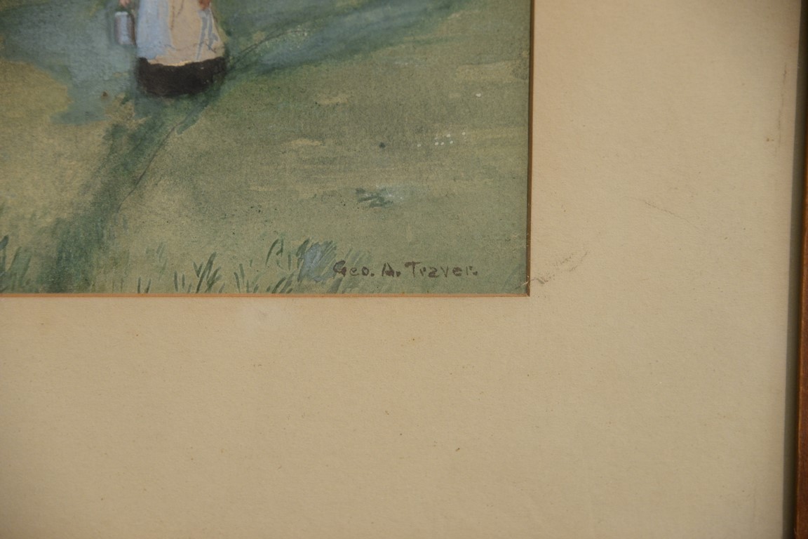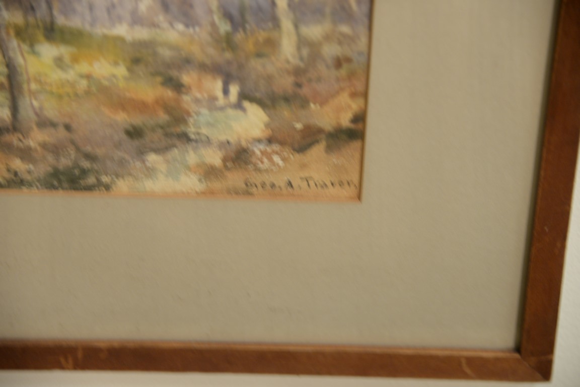 Lot 445: Four framed pieces to include a pair of George Traver 1864-1928 watercolors, Autumn and Spring Morning, signed Geo A Traver, and a…