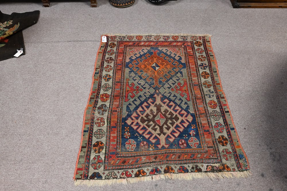 Lot 445: Four Throw Rugs, to include two Native American, 2′ 10″ x 3′ 10″; 2′ 3″ x 4′ 6″; 4′ 10″ x 6′ 2″; 1′ 4″ x 6′.