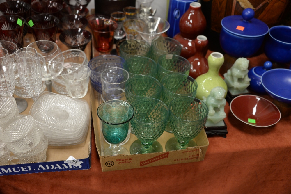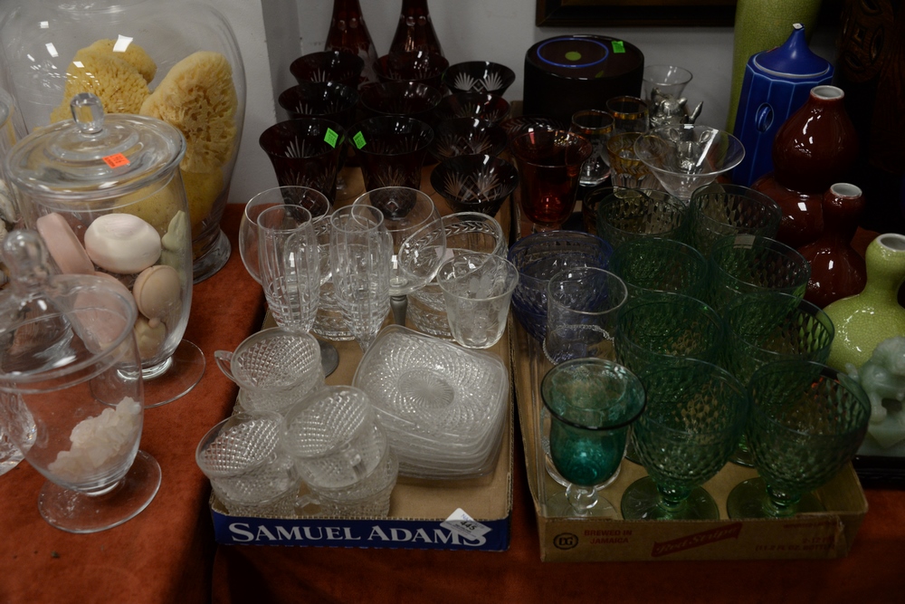 Four Tray Lots of Glass, to include ruby cut to clear stems, along with Bohemian decanters, Provenance: David and Cynthia Kim, 22 Stoney Wylde Lane, Greenwich, Connecticut. View home by visiting: https://www.zillow.com/homedetails/22-Stoney-Wylde-Ln-Greenwich-CT-06830/177238281_zpid/.