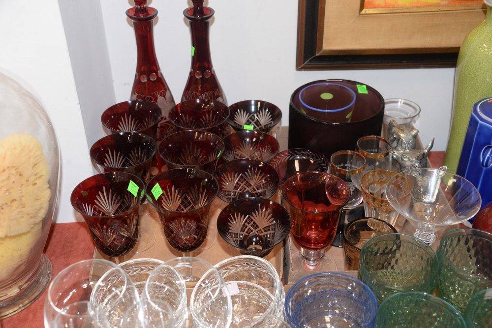 Lot 445: Four Tray Lots of Glass, to include ruby cut to clear stems, along with Bohemian decanters, Provenance: David and Cynthia Kim, 22 St…
