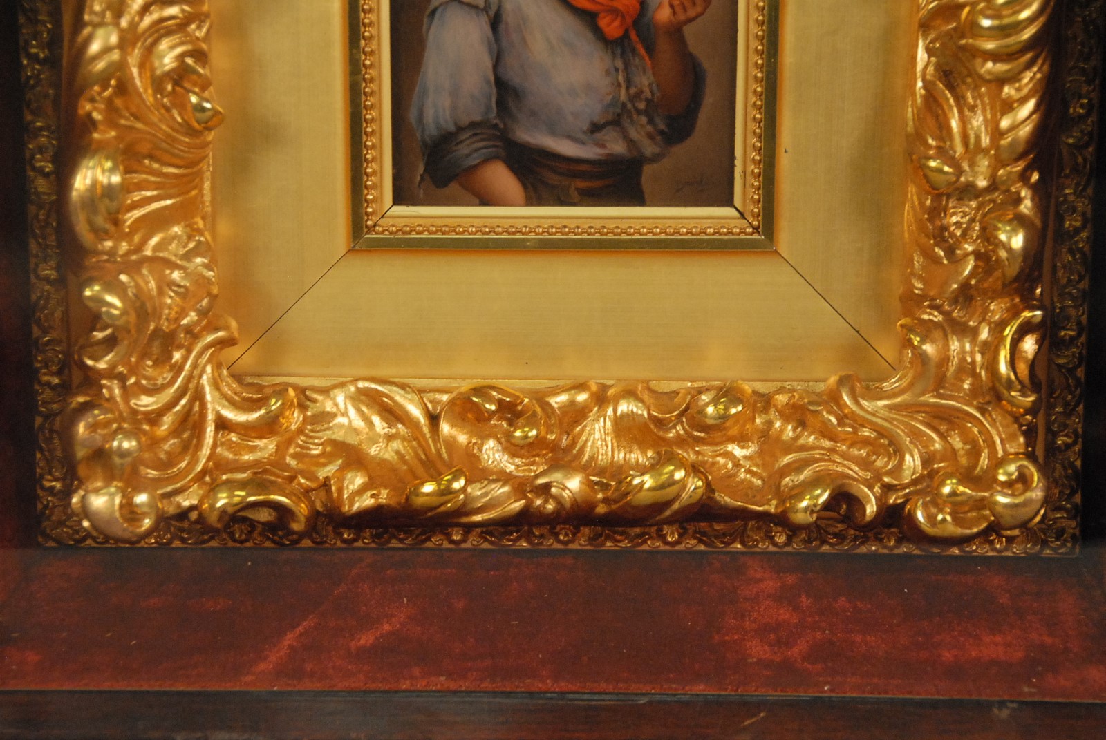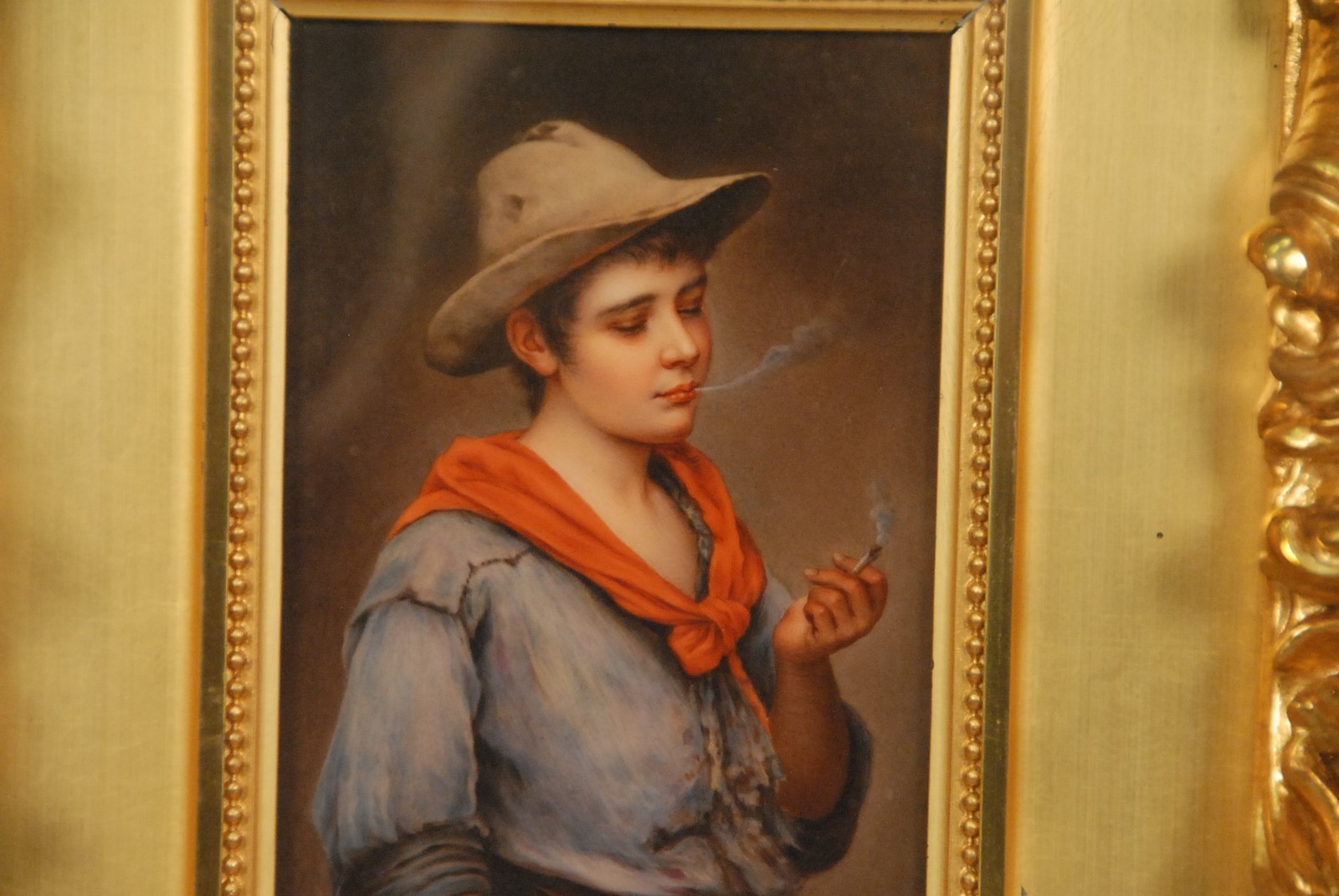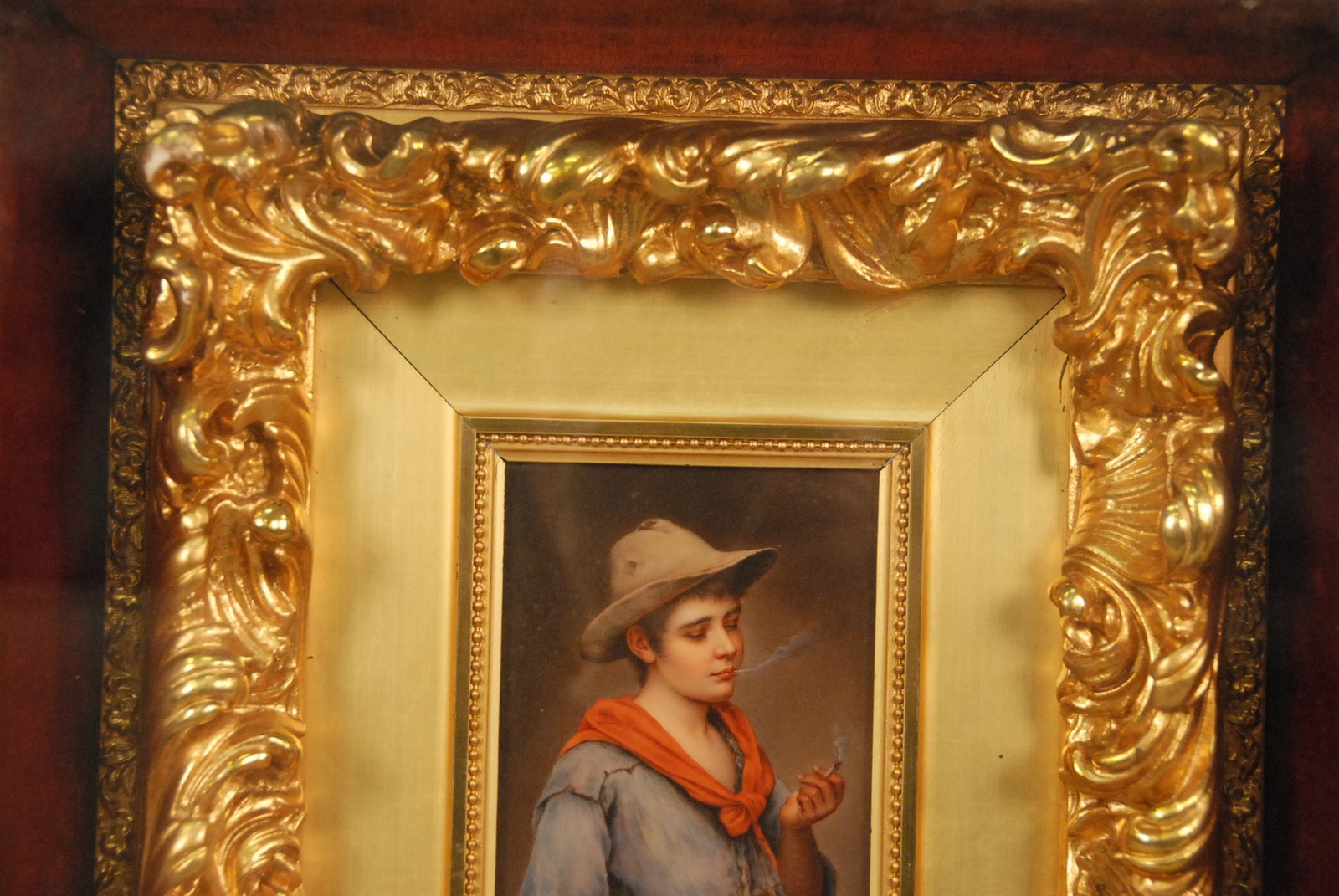 Lot 445: Painted porcelain plaque PICCOLO MACH BLAAS boy smoking with gold frame in shadow box frame box size: 19 1/2 x 17 1/4