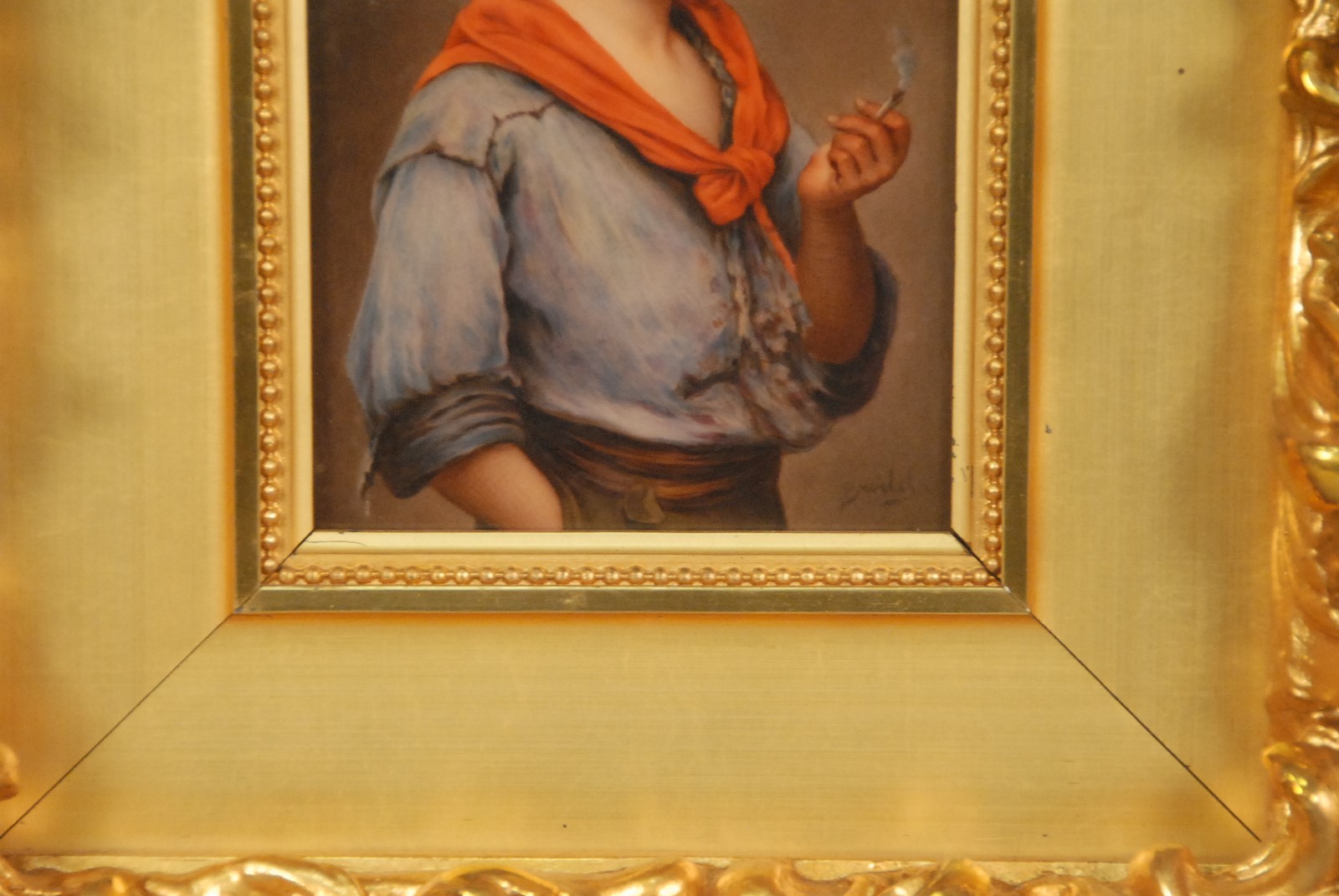 Painted porcelain plaque PICCOLO MACH BLAAS boy smoking with gold frame in shadow box frame box size: 19 1/2 x 17 1/4