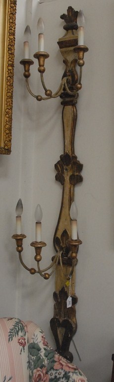 Pair of carved and paint decorated sconces. Provenance: property from a home in Rockville Center, New York which was decorated by Iris Apfel. ht. 64in.