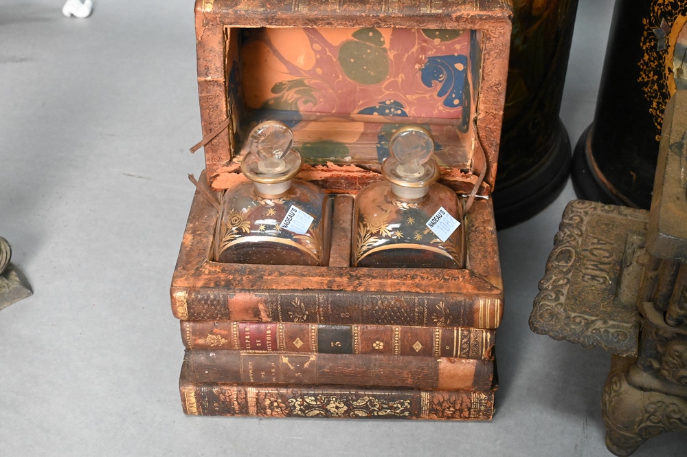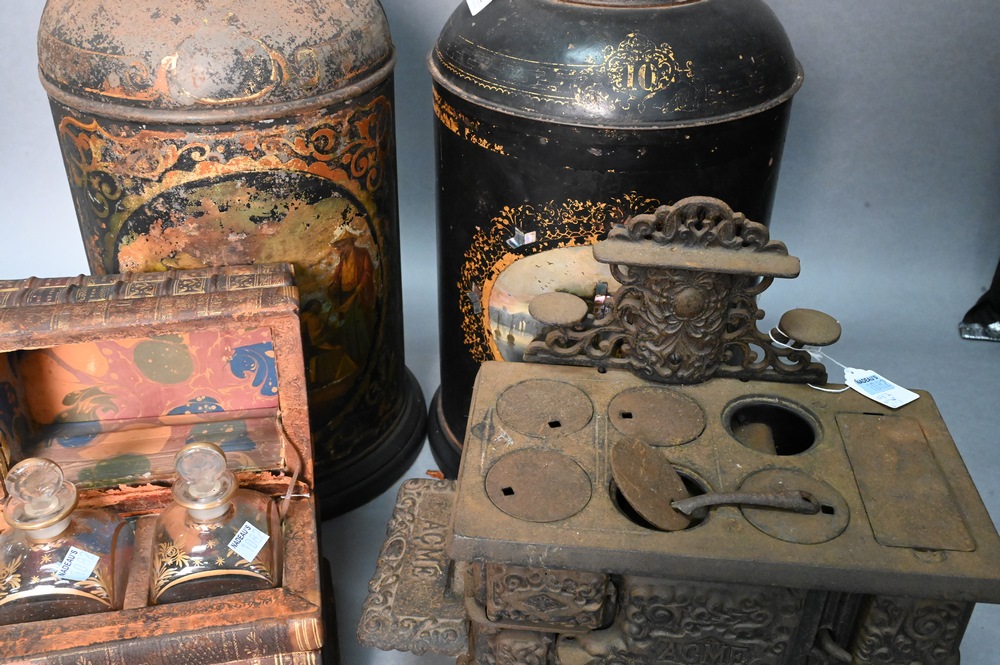 Lot 445: Pair of Tole Covered Canisters, made into lamps, iron doll stove, leather book, along with leather book decanter box, can height 18 inches. Provenance: Estate of Florence Yannios, Waterfront Home, Guilford, CT.