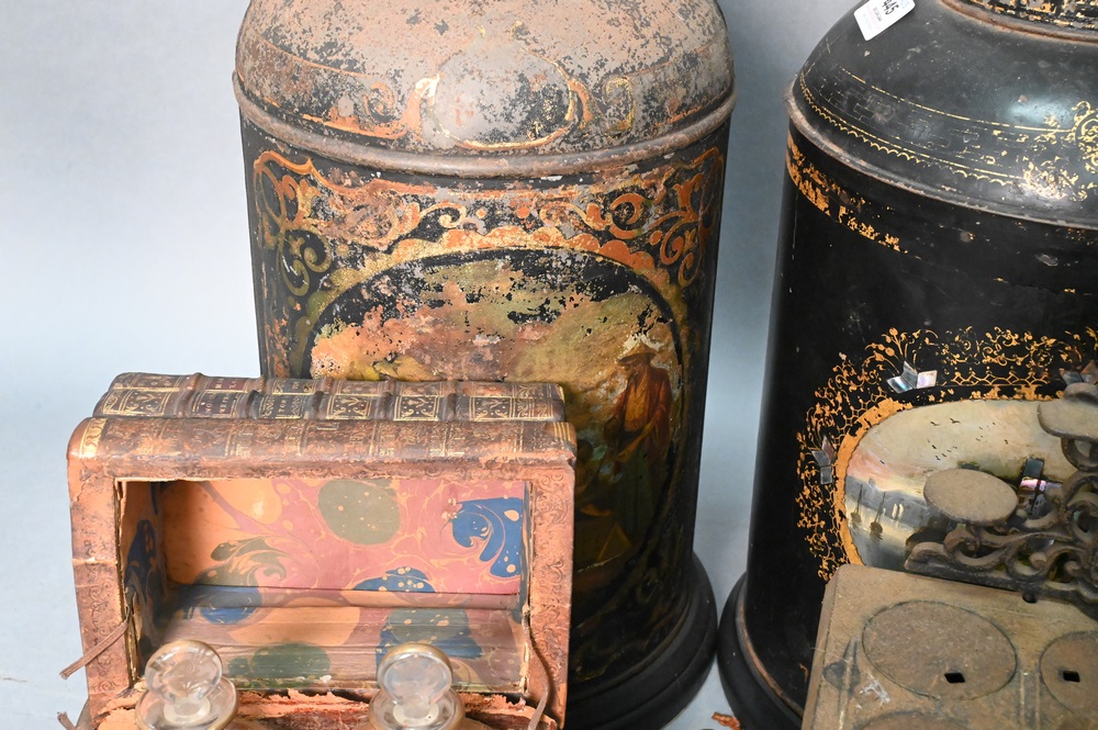 Pair of Tole Covered Canisters, made into lamps, iron doll stove, leather book, along with leather book decanter box, can height 18 inches. Provenance: Estate of Florence Yannios, Waterfront Home, Guilford, CT.