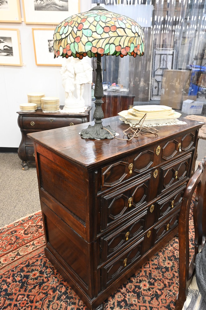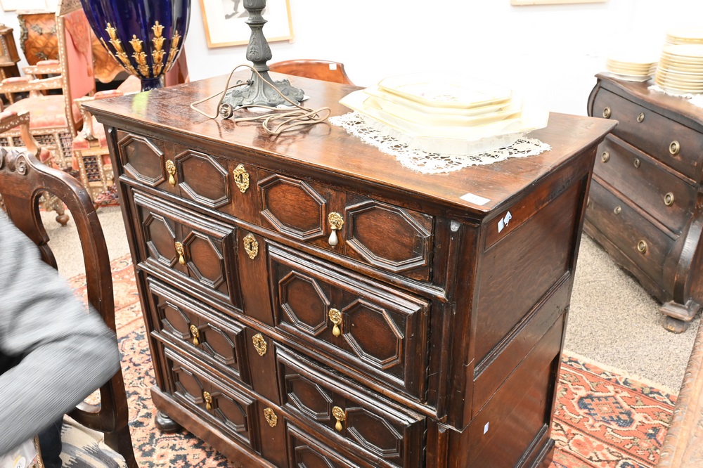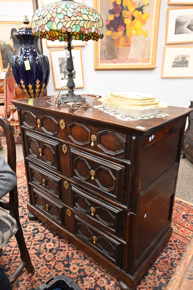 Lot 445: Stuart Oak Chest, in two parts, rectangular top above a case of four drawers, each with four octagon panels with straight apron and…