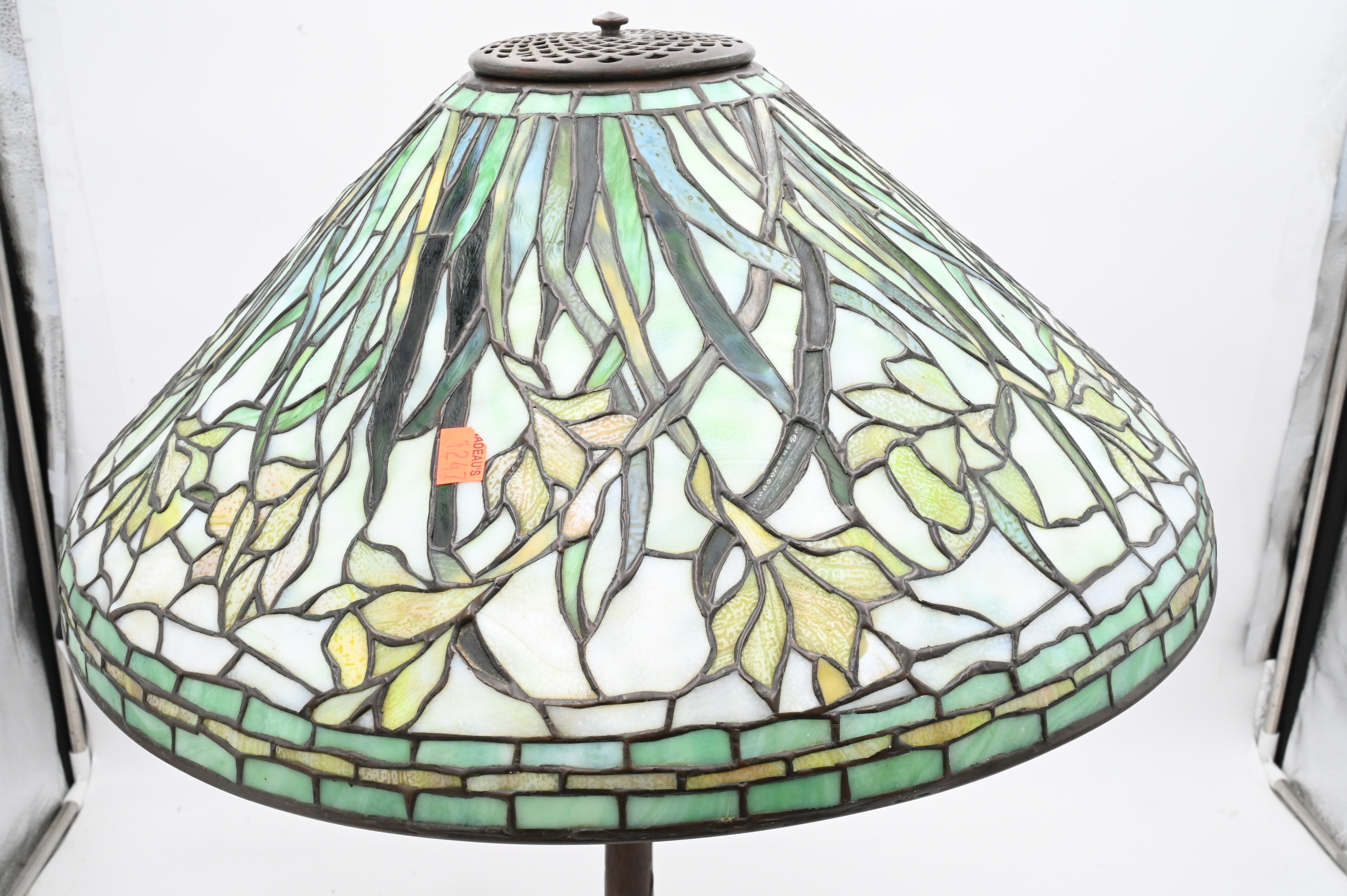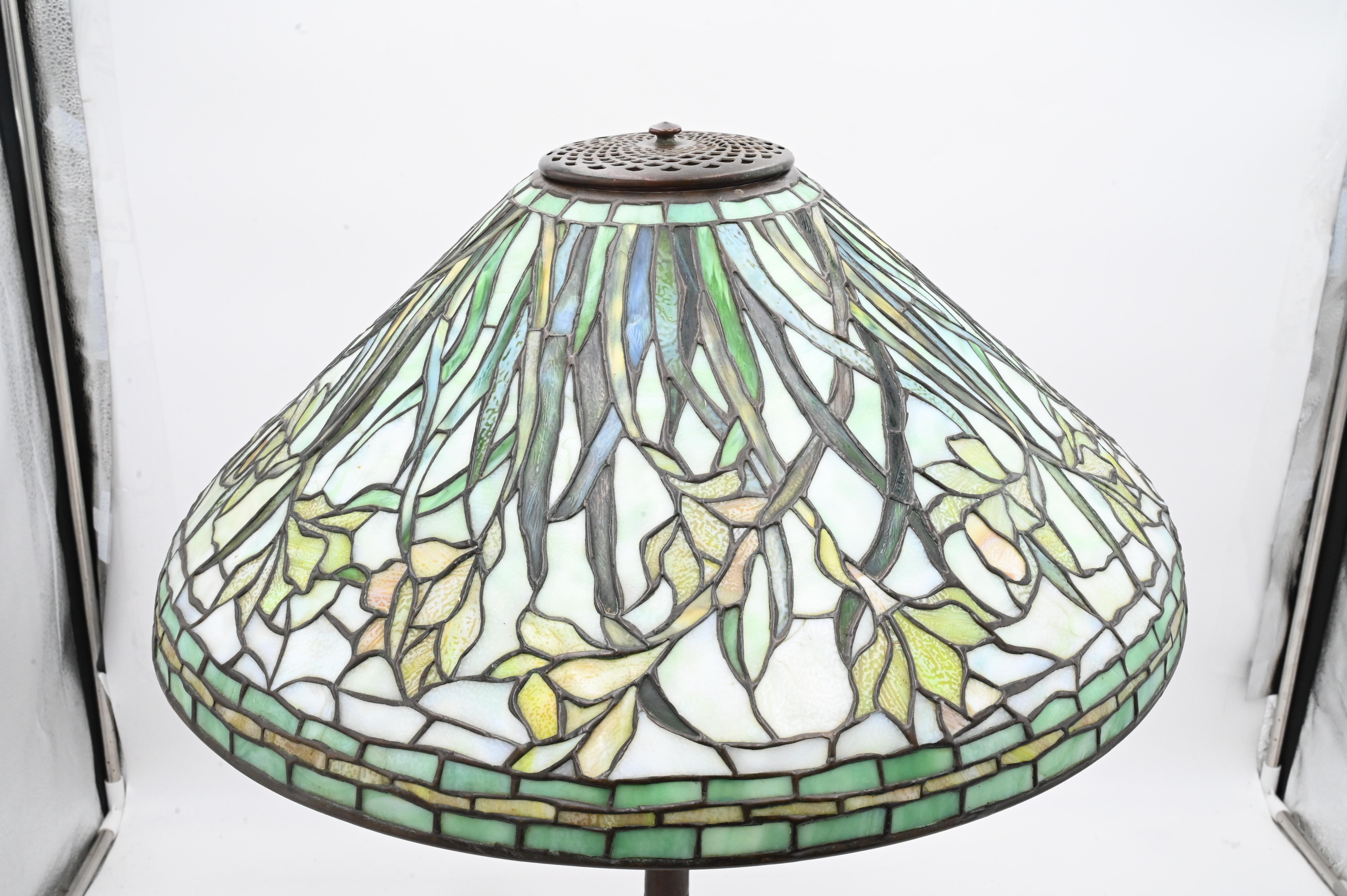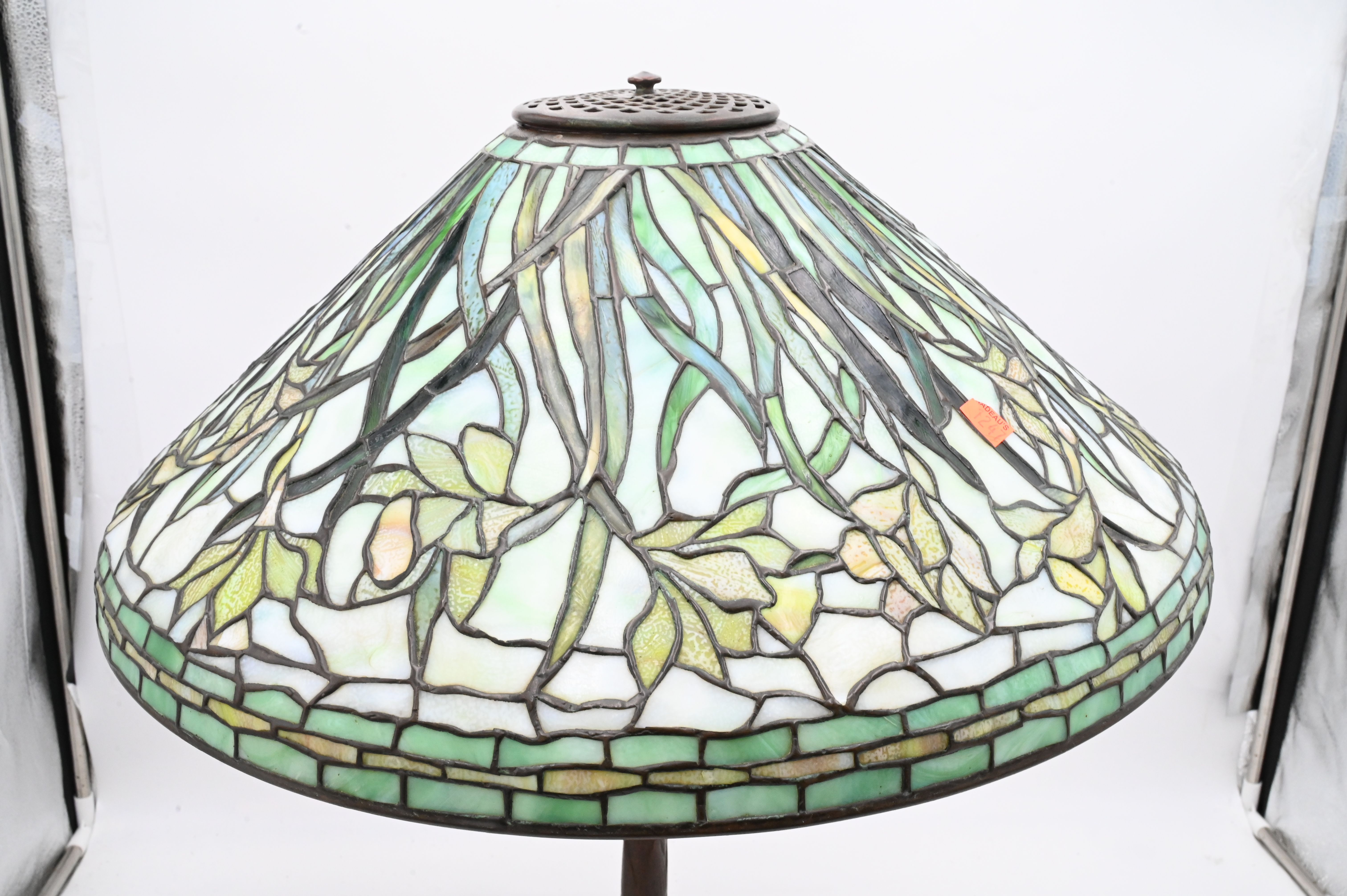 Tiffany Studios Daffodil Table Lamp, having daffodil leaded glass shade marked “Tiffany Studios, New York” over four sockets on bronze base marked “Tiffany Studios, New York, 1807”, height 25 1/2 inches, shade diameter 19 1/2 inches, presents well, shade sits slightly off kilter, shade with approximately 10 very small cracks, slight wear to top cap.